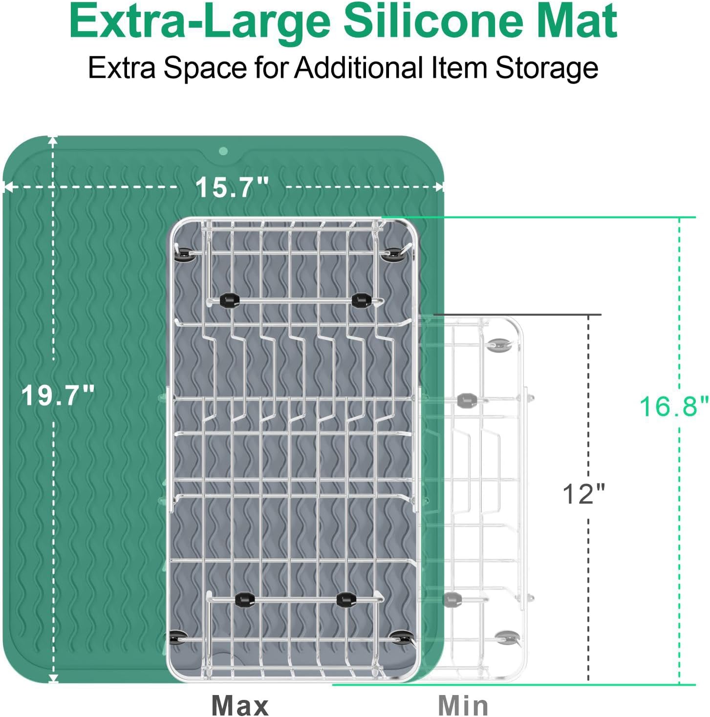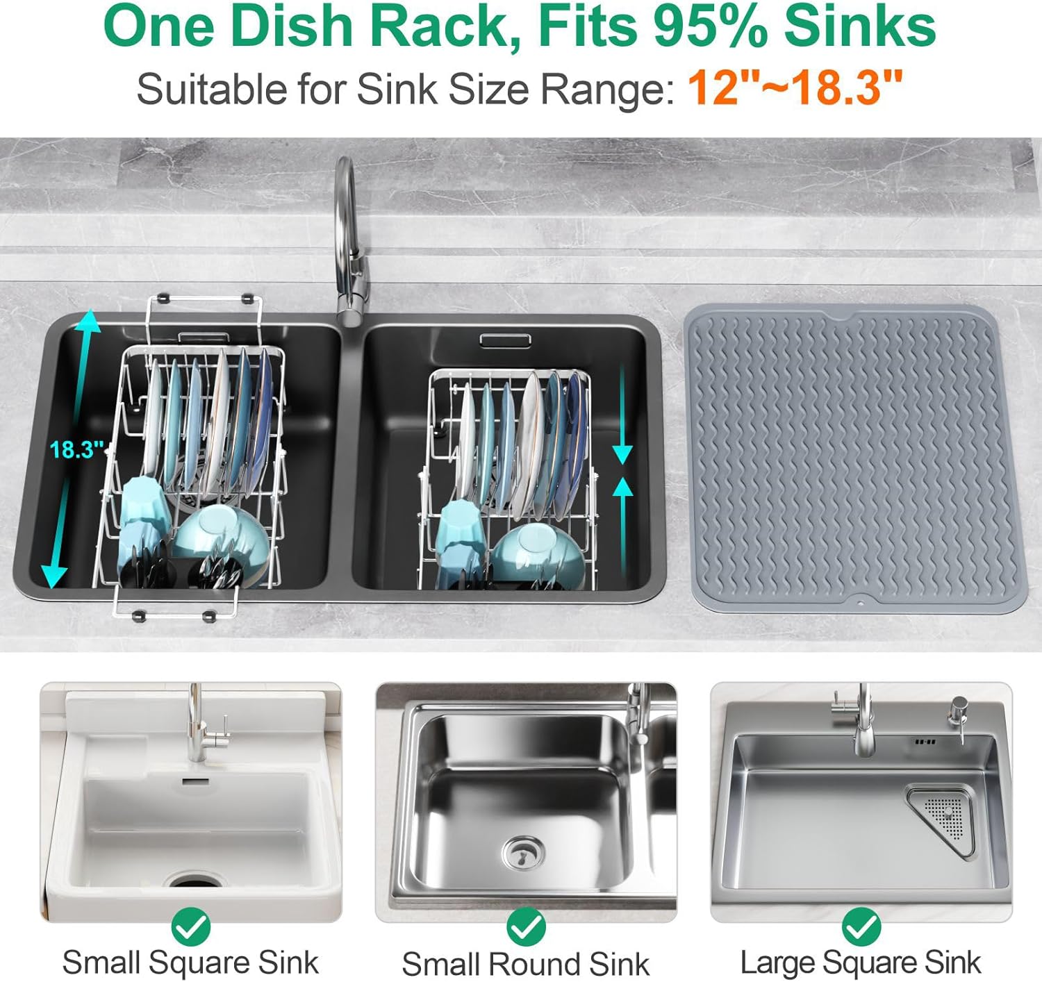 GSlife Expandable in Sink Dish Drying Rack Small with Silicone Mat - Stainless Steel Capacity Adjustable Over The Sink Dish Rack with Utensil Holder for Counter or Inside Sink (12.4" -16.8"), Silver