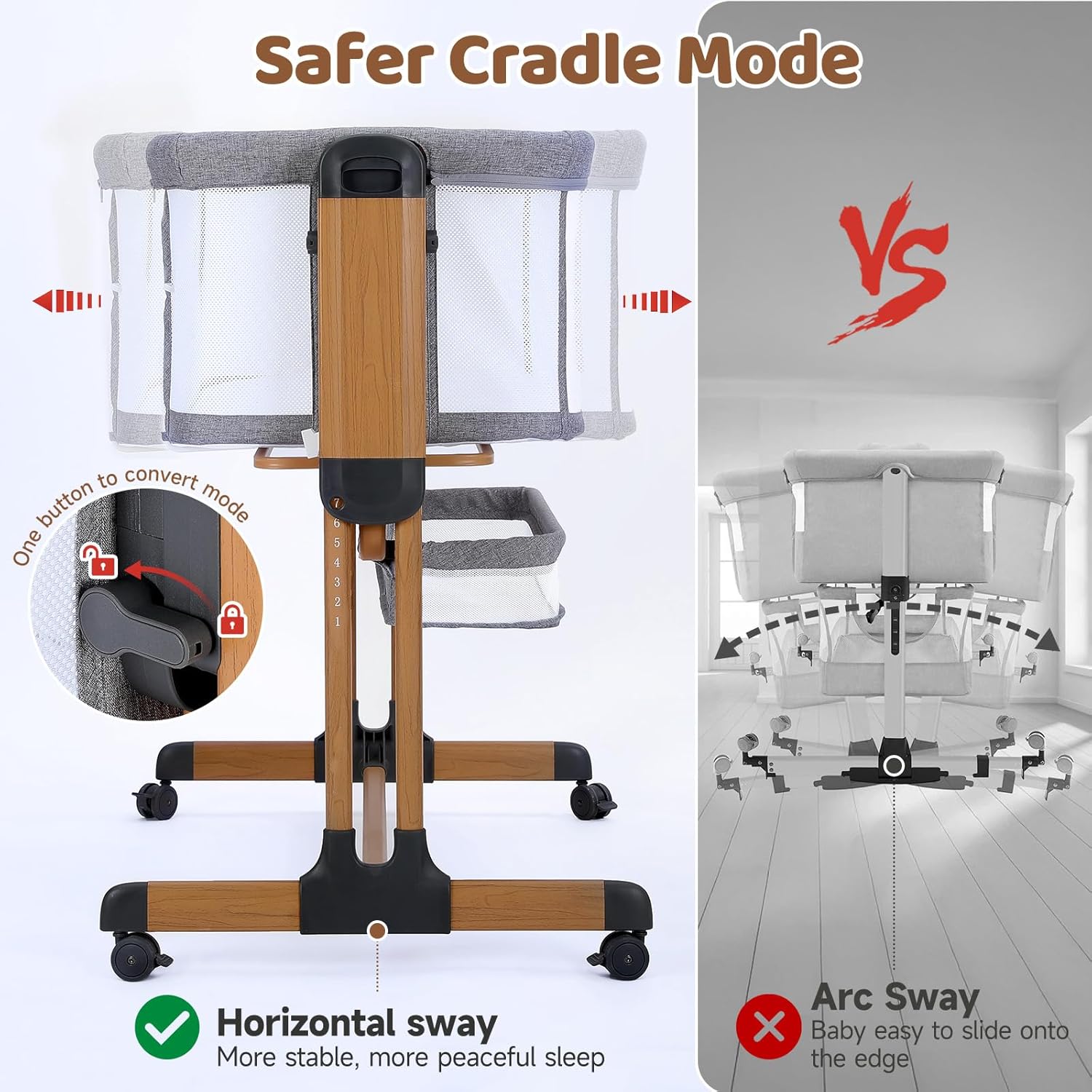 - 【Baby Bassinet with Wheels】 The baby bassinets bedside sleeper is equipped with four lockable 360°swiveled wheels, allowing for easy mobility around bedrooms and living rooms.