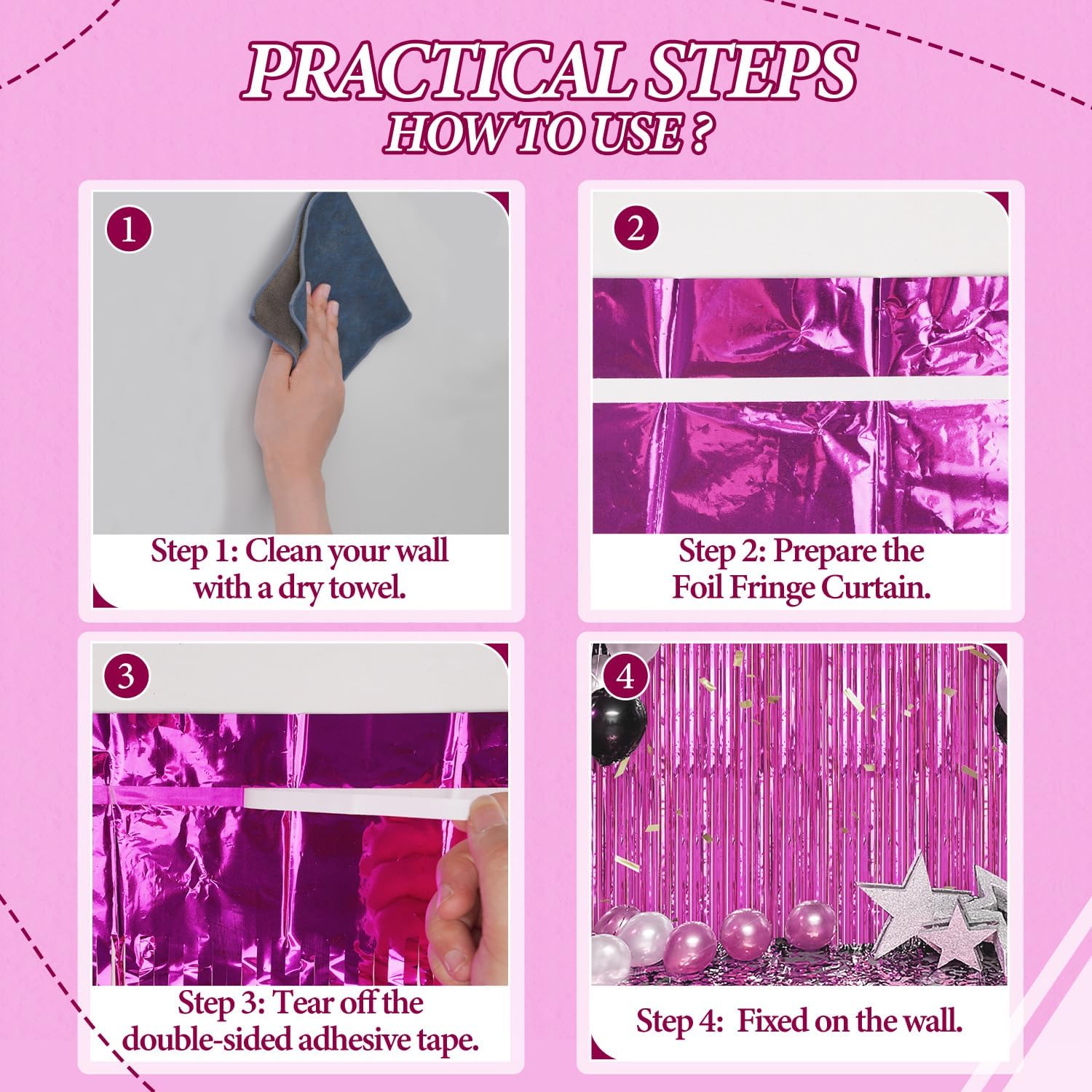 - 【Easy and Convenient Installation】These foil fringe curtains are easy to install and can be quickly hung on smooth surfaces using the included double-sided adhesive tape. No extra tools or materials required.