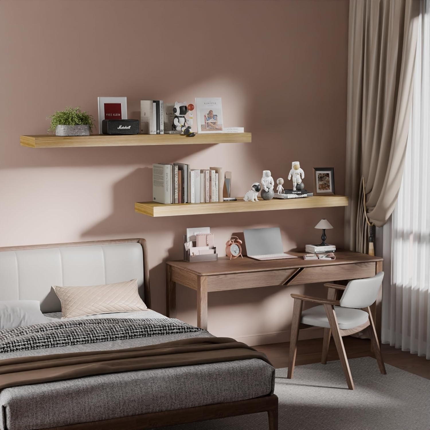 - 【𝑽𝒆𝒓𝒔𝒂𝒕𝒊𝒍𝒆 𝑼𝒔𝒆】With an even coating on all surfaces,Our floating shelves are versatile use, making them ideal for bathrooms,kitchens,bedroom.The generous 6.7" width accommodates a variety of items,from bathroom essentials to books and decorative pieces.