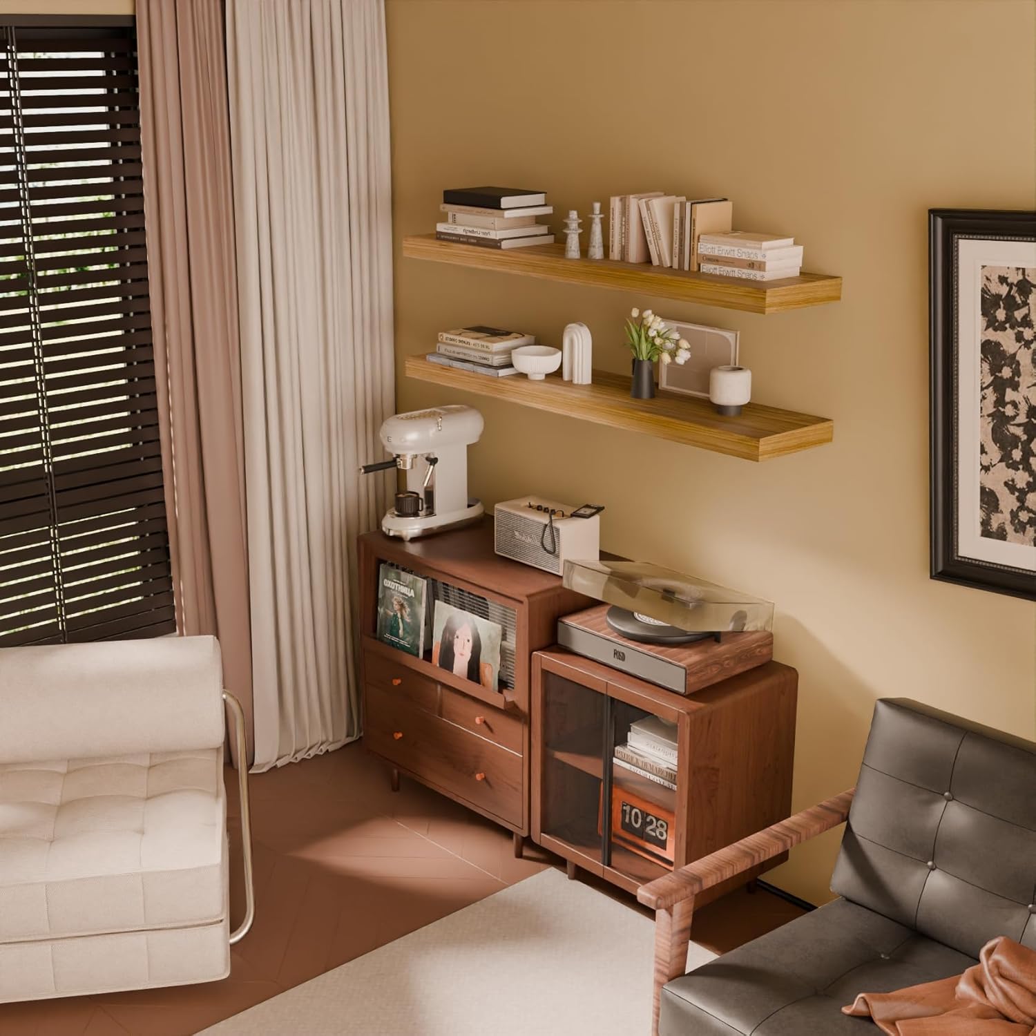 These wall shelves are both functional and stylish, giving my living room a fresh look.