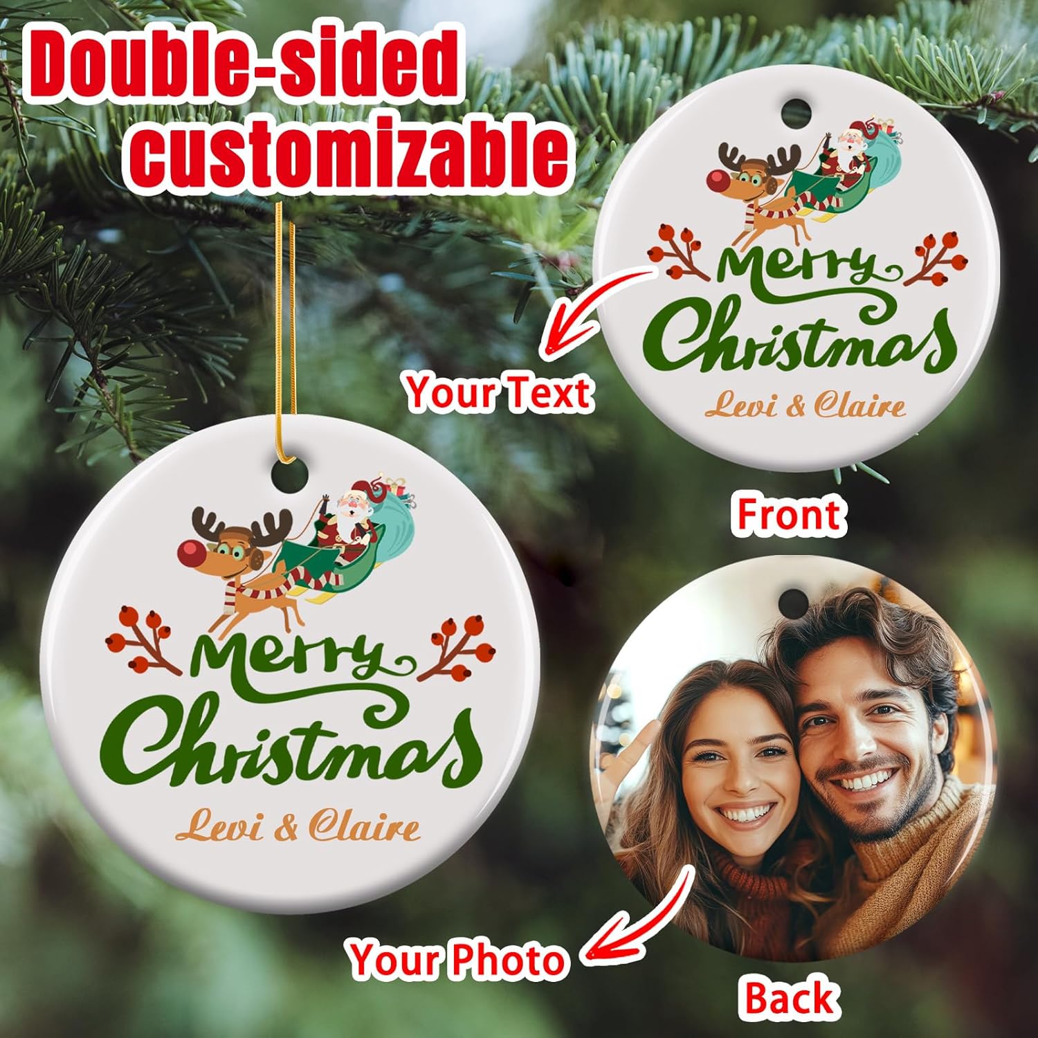 Personalized Christmas Ornaments 2025 - Custom Double-Sided Photo Ceramic Xmas Tree Hanging Decor, Unique for Family Friends (A02-Ceramic Style)