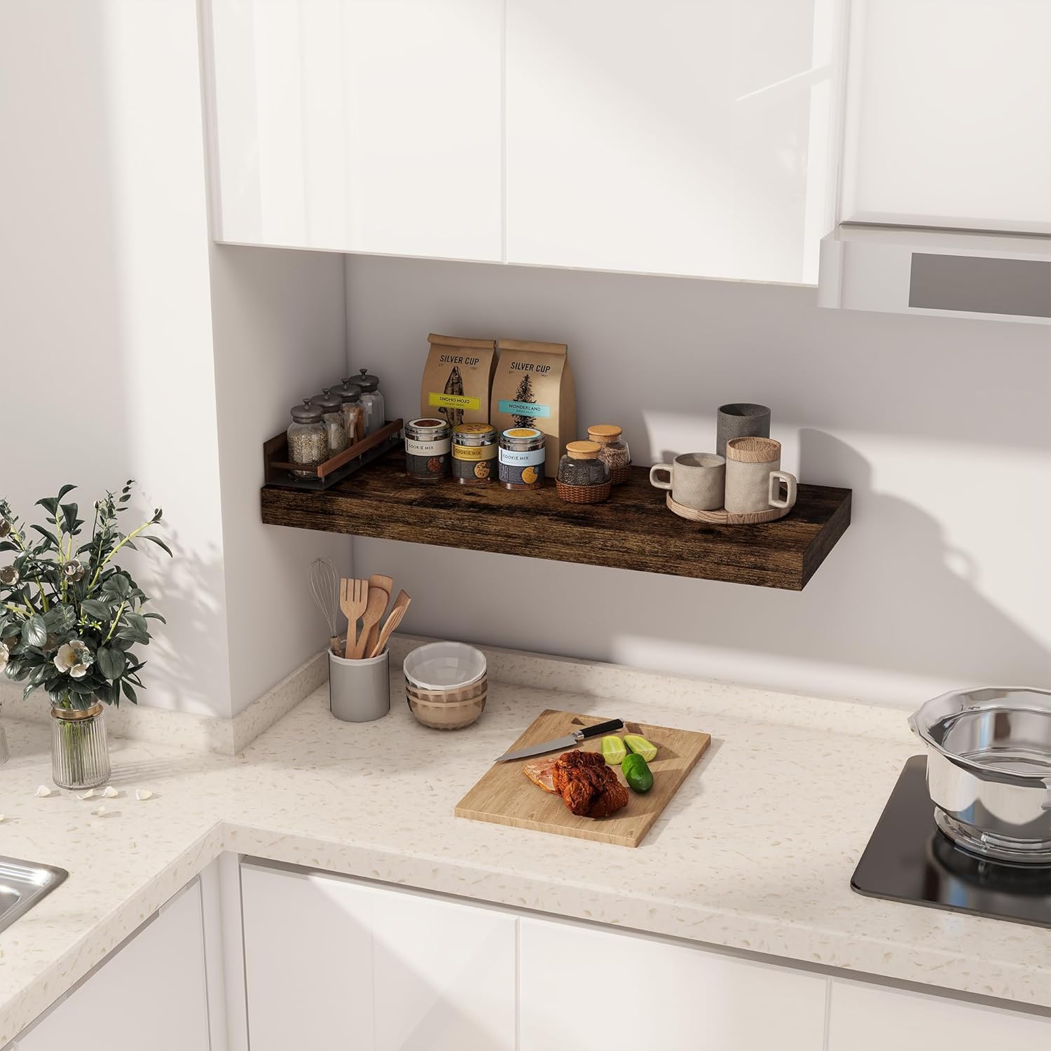 - 【FARMHOUSE RUSTIC WALL SHELF】These floating shelves are made of premium engineered wood board and invisible one-piece bracket. The rustic wooden grain surface add character and warmth to any modern or traditional interior with these thick floating shelves, contrast shelves at staggering heights on the wall or mount side-by-side or in the corner for a clean streamlined look.