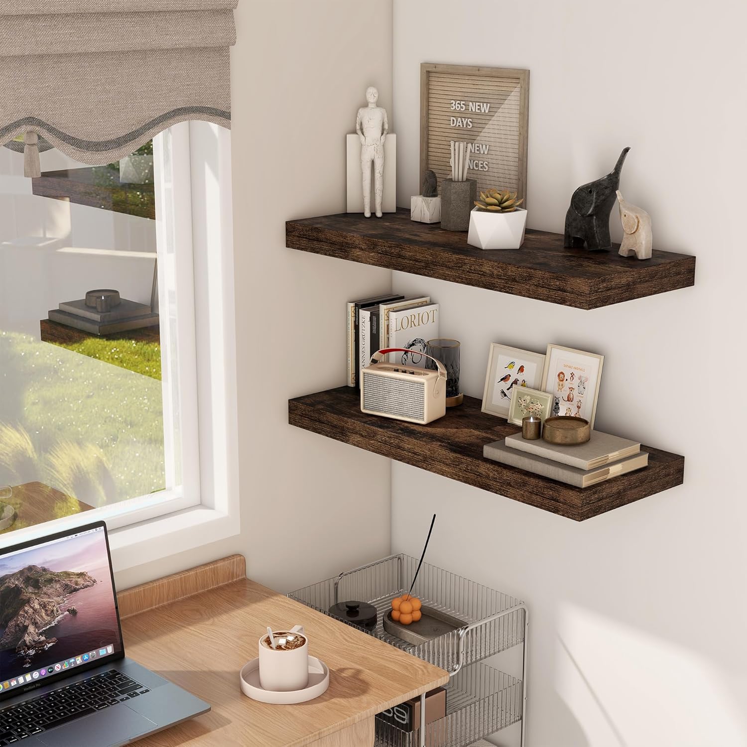 - 【DECORATIVE & FUNCTIONAL】The wall-mounted floating shelves are designed for decoration and storage, utilizing and decorating any space in your home. Used as shelf decor to show your collection, books, or prize, the hanging shelves are perfect for displaying your photo frame, small plants, model, or audio in your living room, office, study. And can also use as over the toilet storage shelf in the bathroom to hold toiletries or used as kitchen shelf to storage condiments.