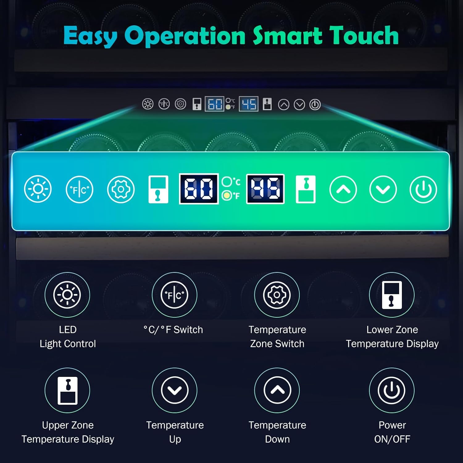 - DUAL-ZONE INDEPENDENT CONTROL & MEMORY FUNCTION - This freestanding wine refrigerator features an independent dual-zone cooling system to store different wines at their ideal temperatures. The upper zone (40-55°F / 5-13°C) is perfect for white and sparkling wines, while the lower zone (55-65°F / 13-18°C) is ideal for reds. The intuitive touchscreen panel allows easy adjustments, and the memory function restores your preferred settings after a power outage. Powered by a high-efficiency compressor, it ensures stable cooling, low noise, and a frost-free environment, preserving your wine’s quality with precision