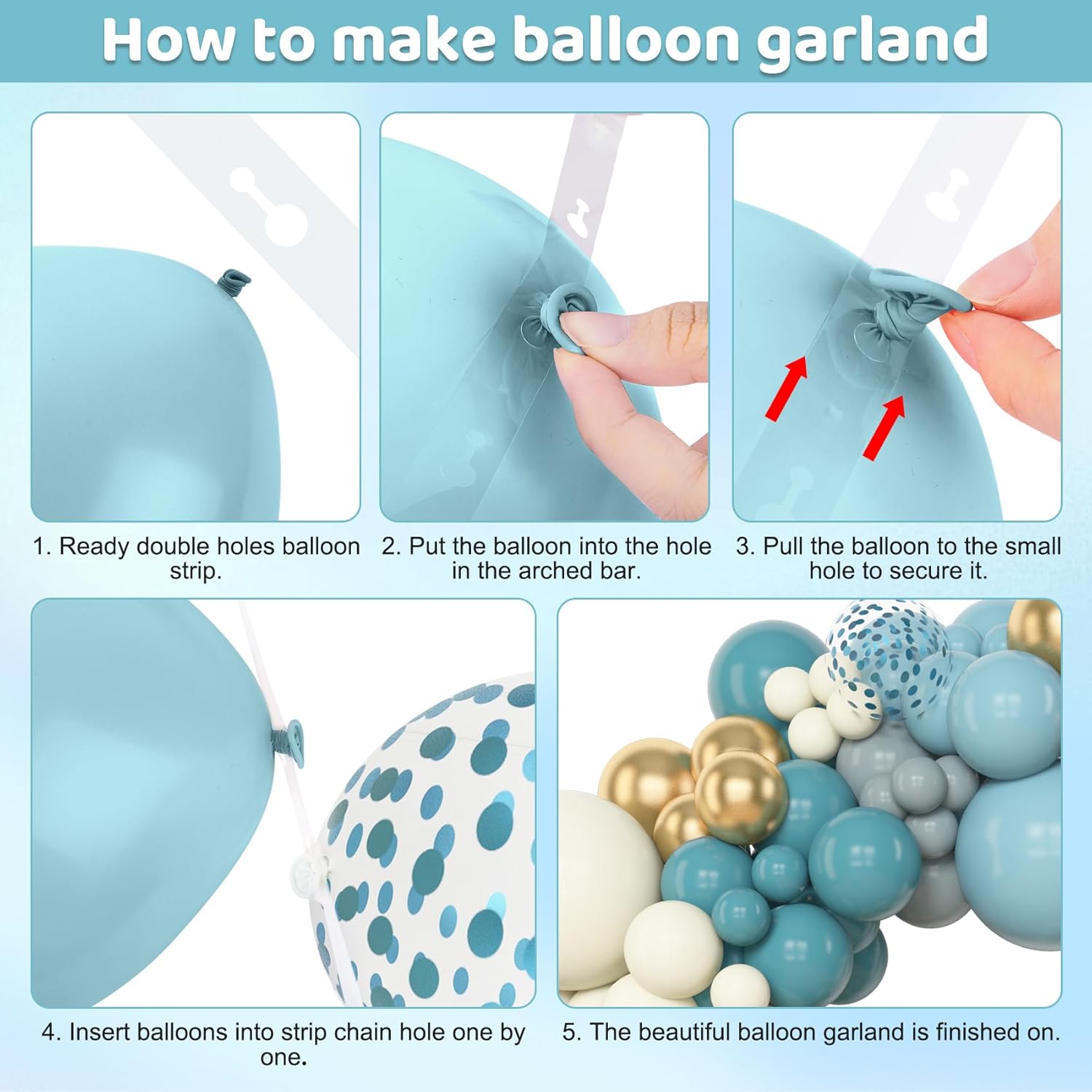 - Easy to Use: Our blue balloon arch kit comes with balloon accessories which can help you create the perfect baby shower balloons arch kit; You can make daisies balloons with flower clips; Hooks can help better secure balloons where you need; Design your blue and gold balloon arch kit by inflating the balloons with helium or air, then attach them with balloon strip or ribbon; And you also can use glue points to add small balloons to the garland