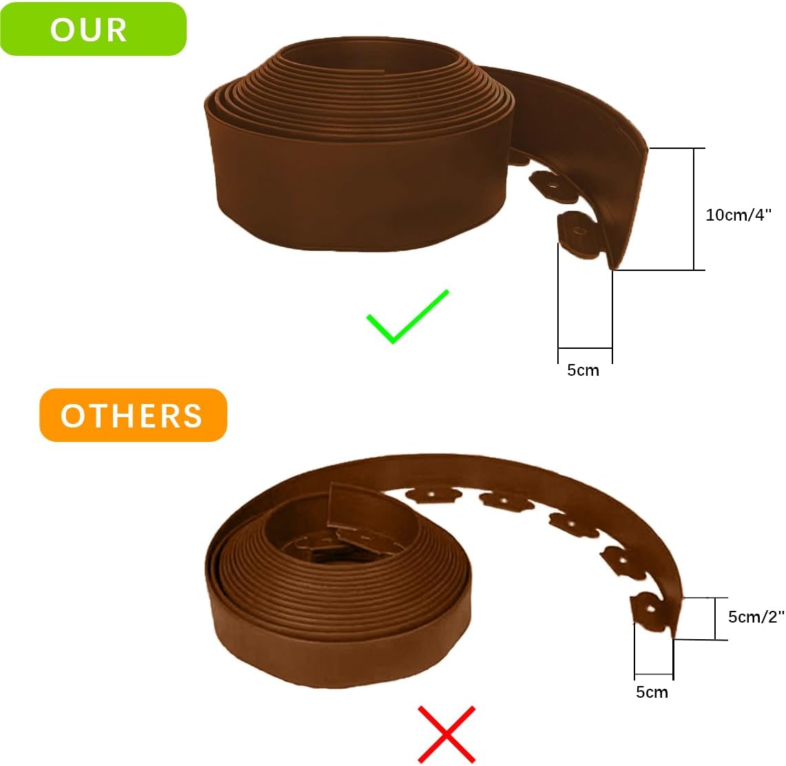 - < SIZE > 49feet/15m length, 4inch/10cm height garden borders with 75pcs 8inch plastic spikes. Note: Just one nail per foot can be installed for fixation, It's needn't for every hole to be filled with stakes.