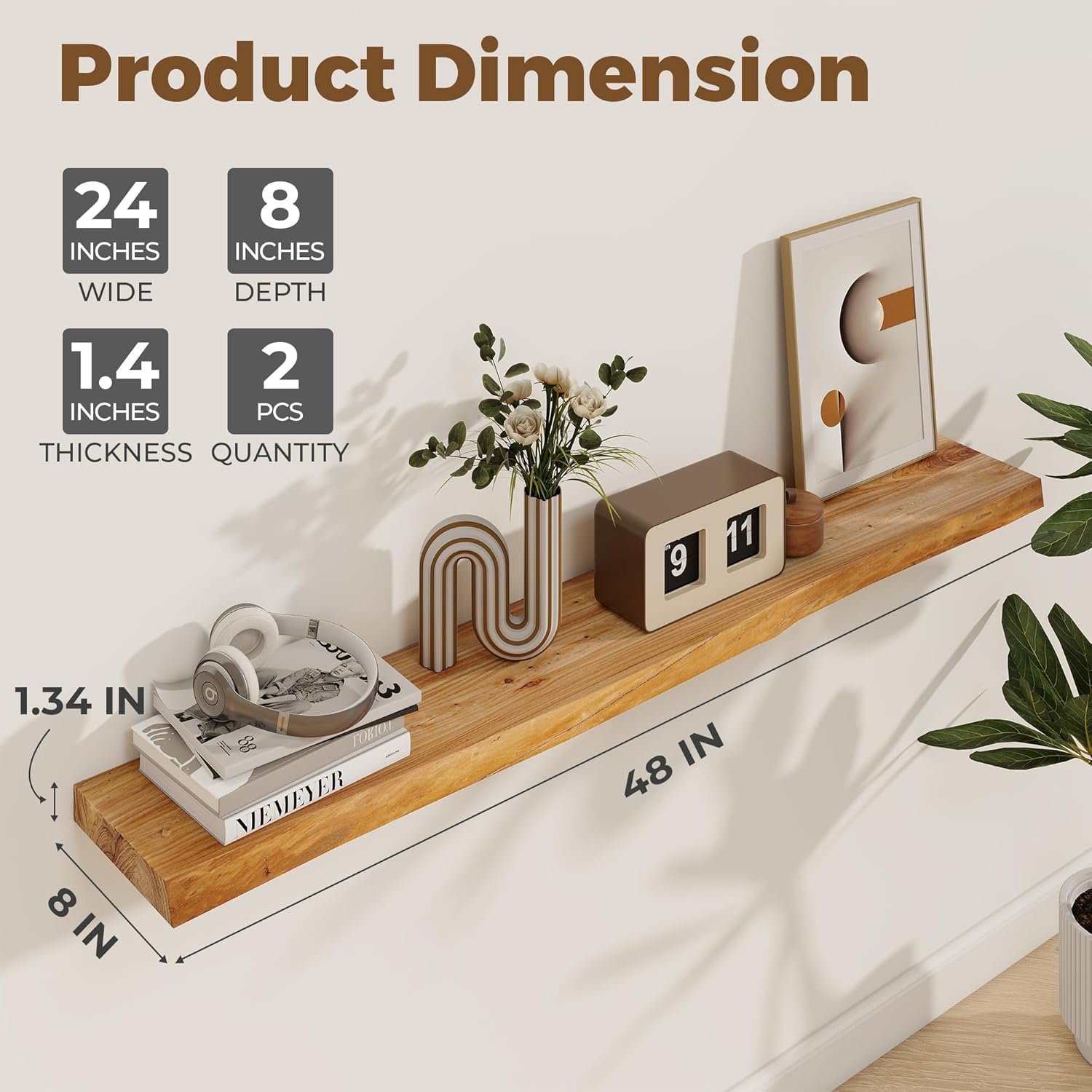 Axeman 48 inch Floating Shelves for Wall - 8'' D Live Edge Rustic Solid Elm Wood Floating Shelves Wall Mounted, Hanging Shelves with Invisible Bracket for Living Room Bedroom Kitchen, Natural