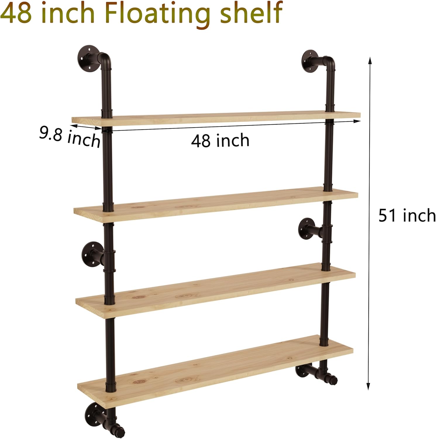 - 【Easy Assembly Required 】 This 48 inch Floating Shelves come with step-by-step instructions and all fittings,including iron pipes,flanges,planks and screws.Just prepare the drill,and follow the installation steps,you will find installing the shelves is a breeze.