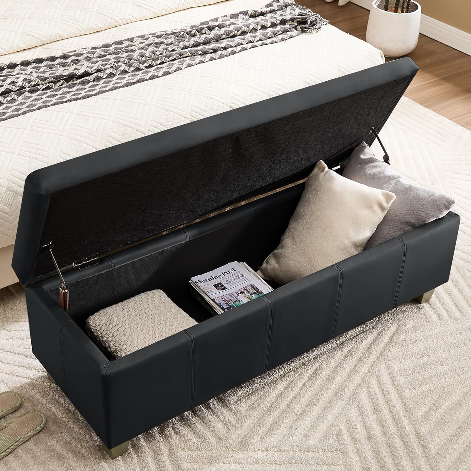 41" Faux Leather Storage Ottoman, Stitch Tufted Rectangle Upholstered End of Bed Storage Bench, Entryway Large Couch Ottoman with Wooden Legs, Dark Black