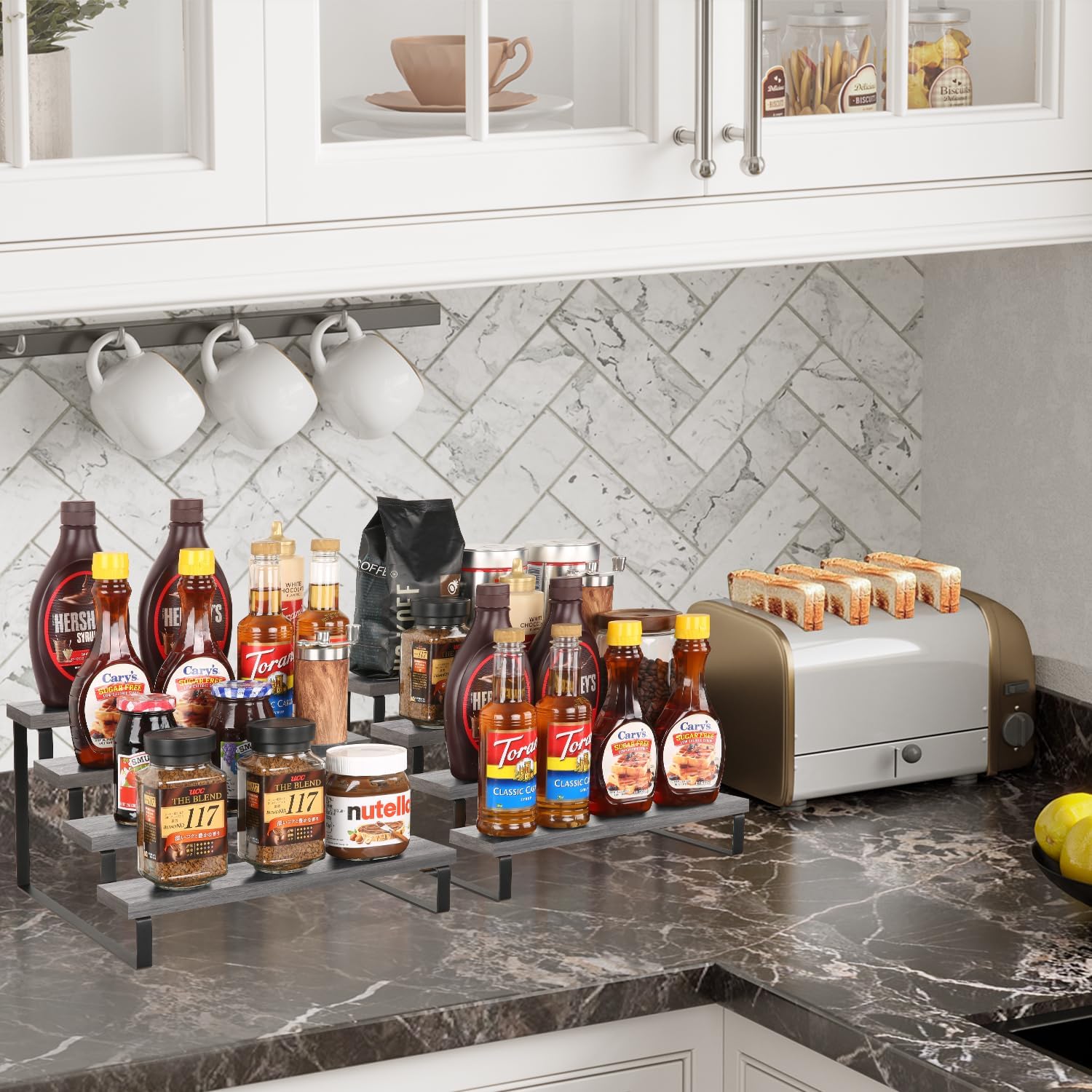 YINMIT Wooden Display Riser Stand, Tiered Perfume and Cologne Organizer Stand, 4 Tier Spice Rack Organizer, Rustic Display Shelf for Candles (4 Tier,2Pack,Grey)