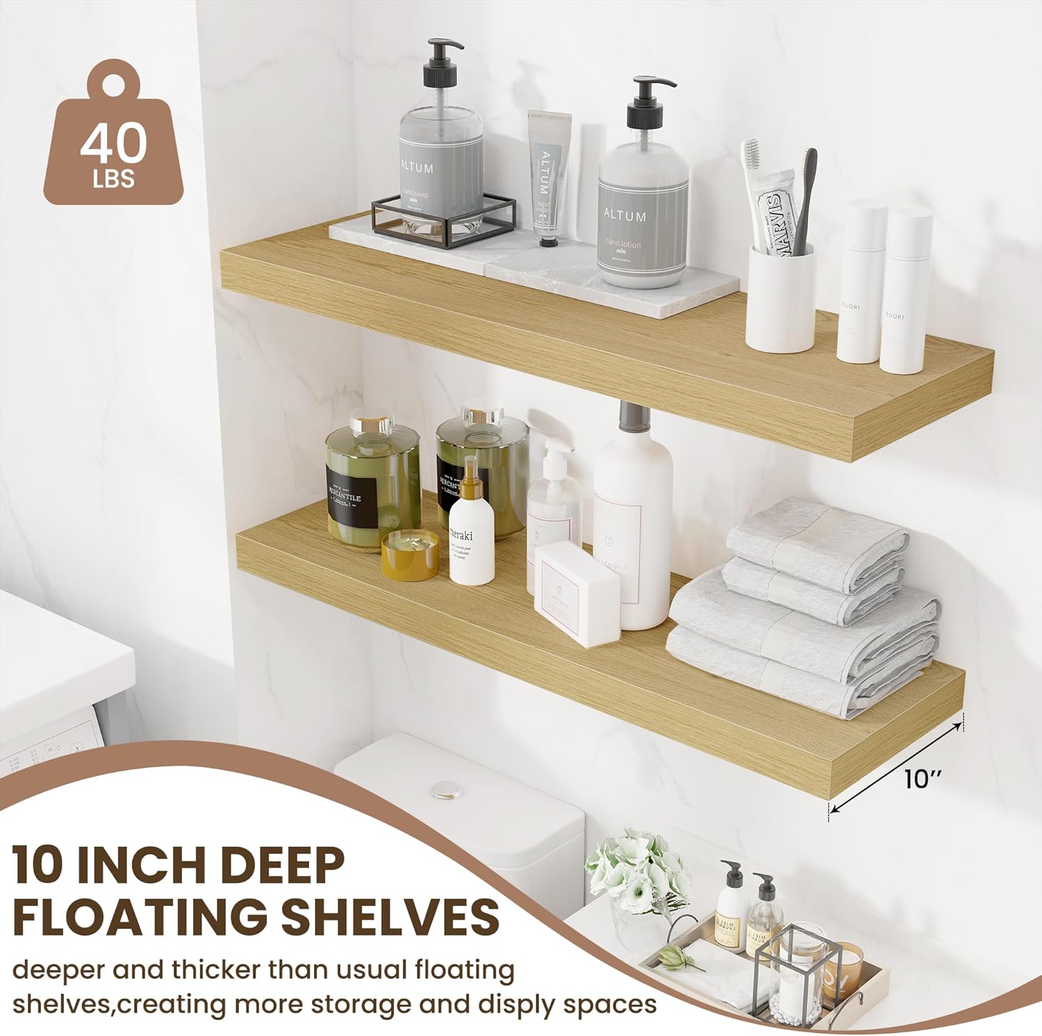 - STYLISH & PRACTICAL: These 10-inch deep floating shelves offer a simple rustic charm and are made from permium engineered wood. With their smooth, natural finish, they add warmth and personality to any room, fitting seamlessly into both modern and classic interiors