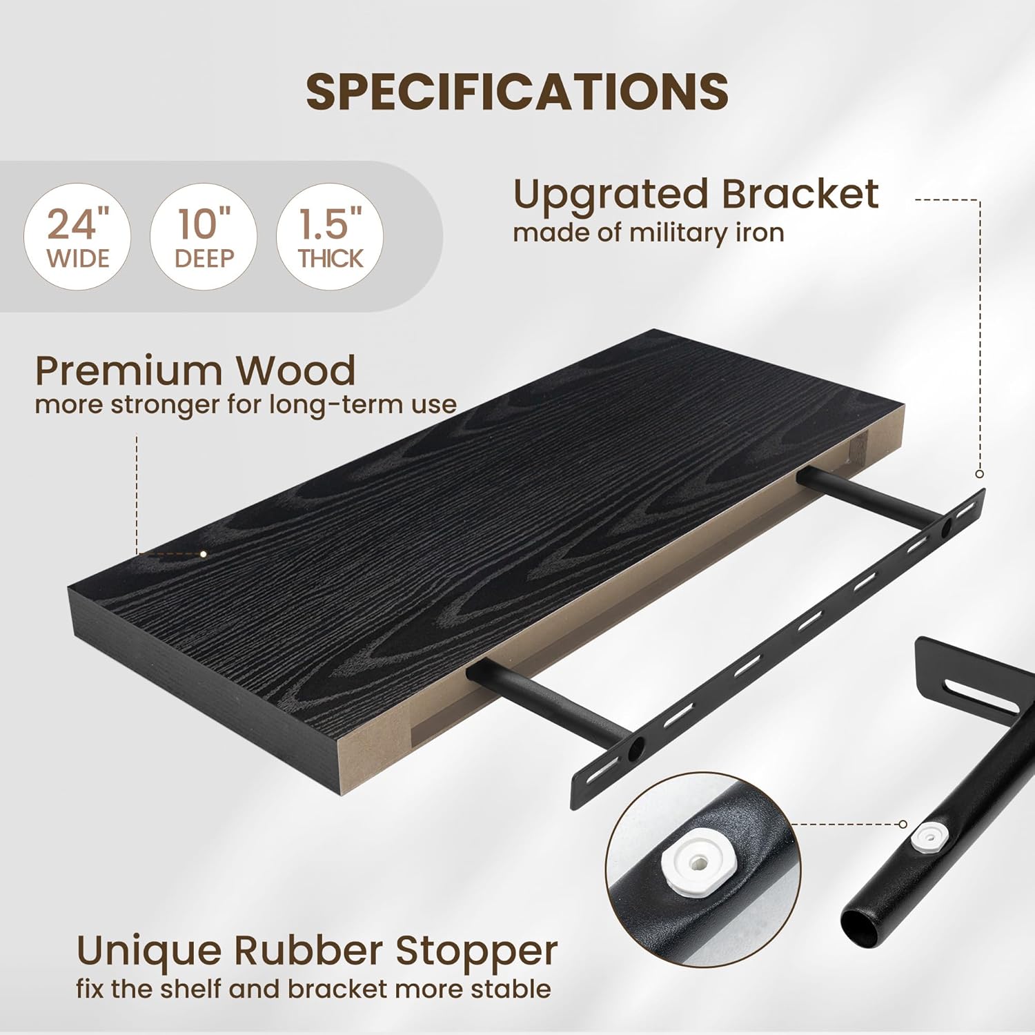 - INVISIBLE & STURDY BRACKET: This floating shelf features a simple and elegant design with an invisible bracket that creates a floating effect. The sturdy hidden support and special rubber stoppers ensure the shelf stays firmly in place, offering both strength and a clean, modern style