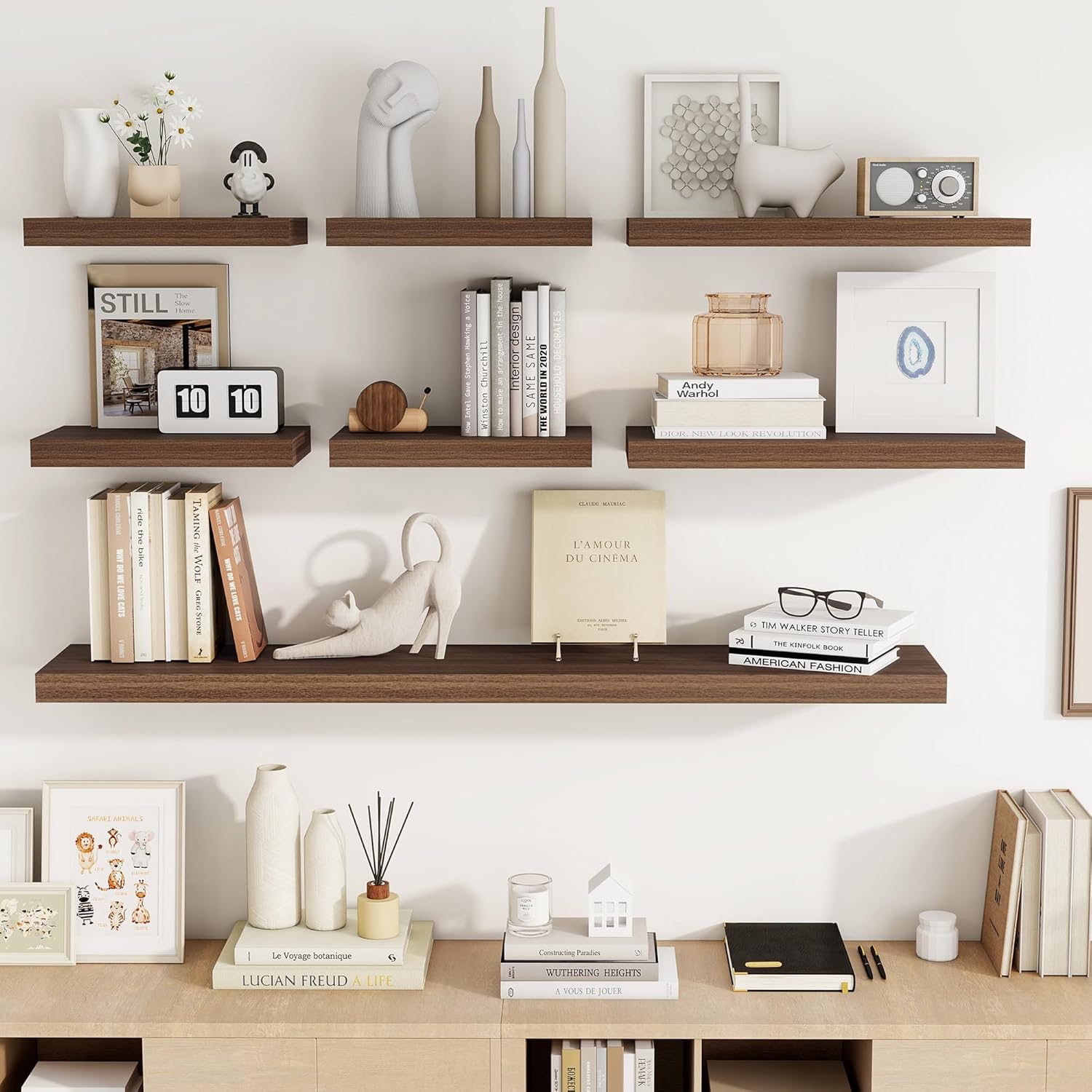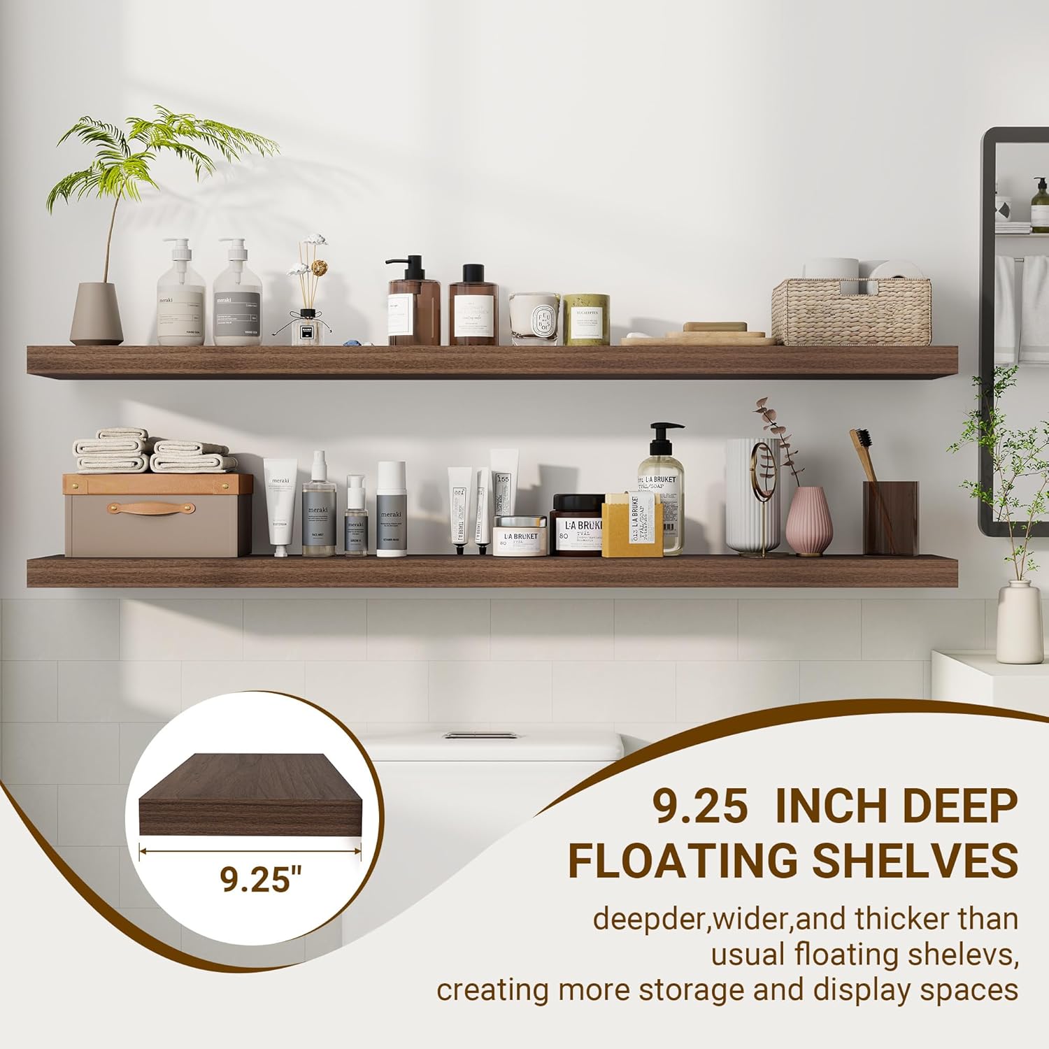 - 【Spacious and Versatile】 With an impressive depth of 9.25 inches and a thickness of 1.5 inches, these shelves provide ample space for a variety of items. Whether it's photos, books, DVDs, or decorative knickknacks, these shelves can handle it all, offering a practical yet stylish storage solution