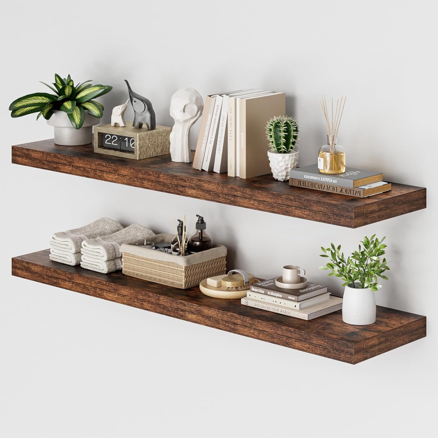 Heimlove 48W x 12D Long Floating Shelf, 12 Inch Deep Floating Shelves for Wall Set of 2, Wood Shelves for Bedroom Living Room Bathroom Kitchen Home Office, Rustic Brown