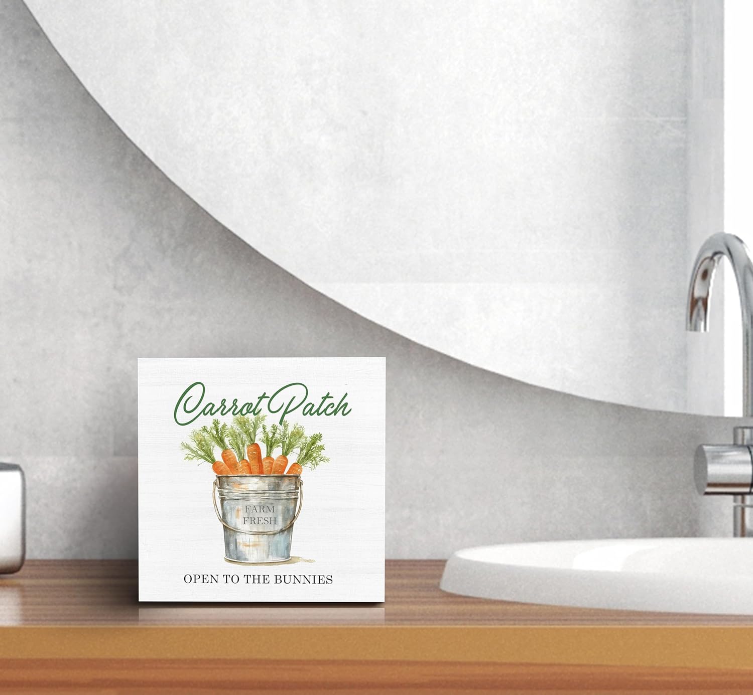 SRADMO Easter Sign, Carrot Patch Easter Wood Box Sign Desk Decor, Easter Carrot Decorations, Farmhouse Easter Theme Wooden Block Box Sign Decoration for Home Office Shelf Table Decor