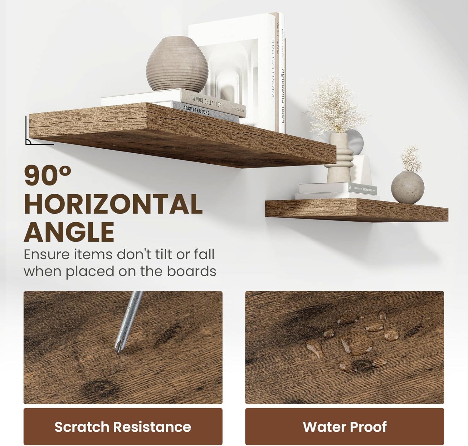 - 【Premium Quality Construction】Crafted from high-grade engineered wood with an invisible one-piece bracket, these floating shelves offer a robust and sleek design. The rustic wooden grain finish not only adds a touch of elegance but also infuses warmth into any room, making them a perfect fit for both modern and traditional interiors.