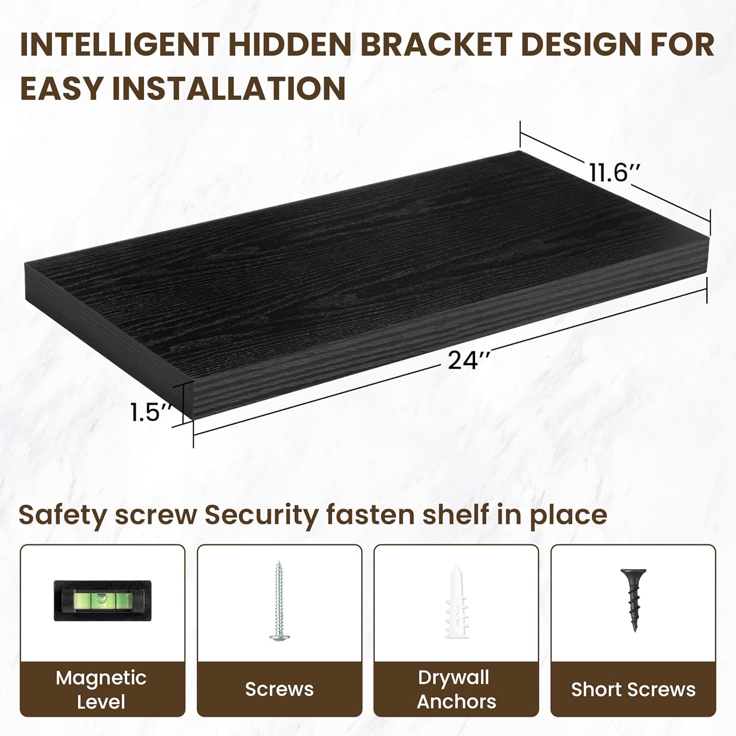 24 Inch Floating Shelves, 11.6 Inch Deep Floating Shelves for Wall, Floating Shelf with Invisible Brackets, Deep Shelves for Bathroom, Bedroom, Living Room, 2 Pack, Black