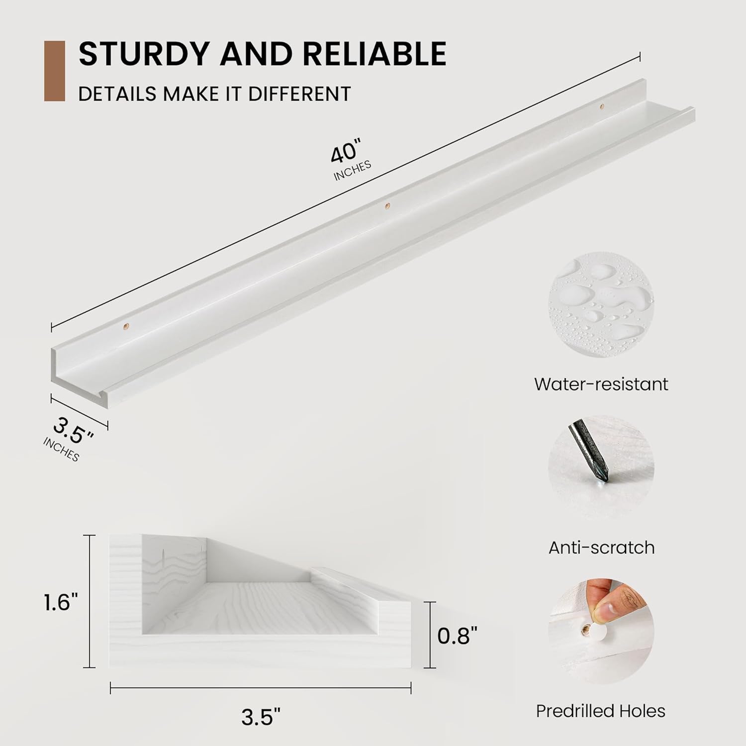 Picture Ledge Shelf, Solid Pine Wood Floating Shelves Set of 2, 40 Inches Nursery Book Shelves for Toys Storage, Kids Bookshelf Wall Mounted for Living Room Bedroom Decor Books Photo Frames, White