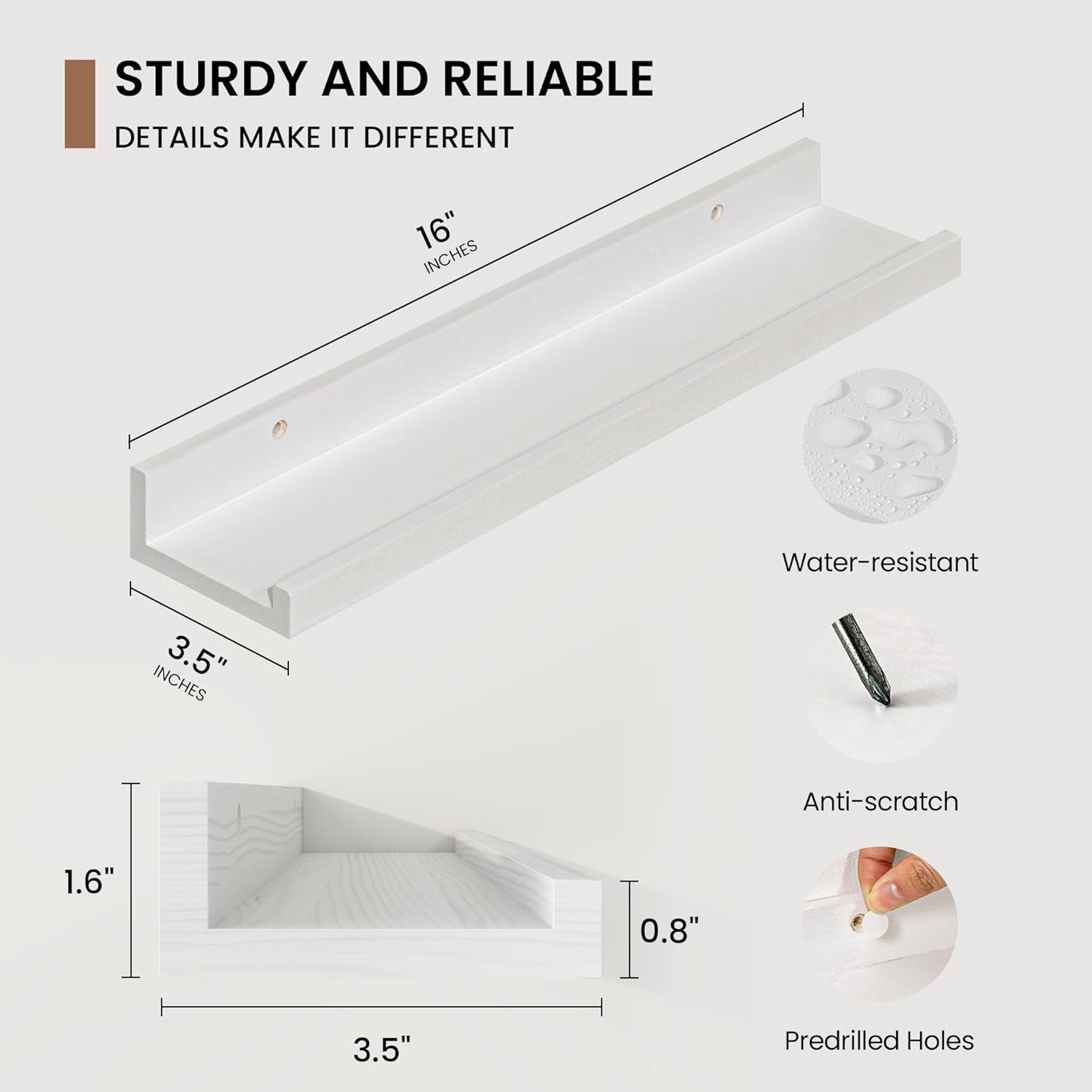 - 3.5" Floating Picture Ledge: Anti-Slip Narrow Design-3.5" ultra-narrow depth holds frames/plants without sliding, even on angled walls. Stud-Mounted Stability-16" pre-drilled holes match standard studs (hardware incl.) for wobble-free install. Clutter-Free Aesthetic-Clean lines blend with farmhouse/Scandinavian decor, focusing on your treasures