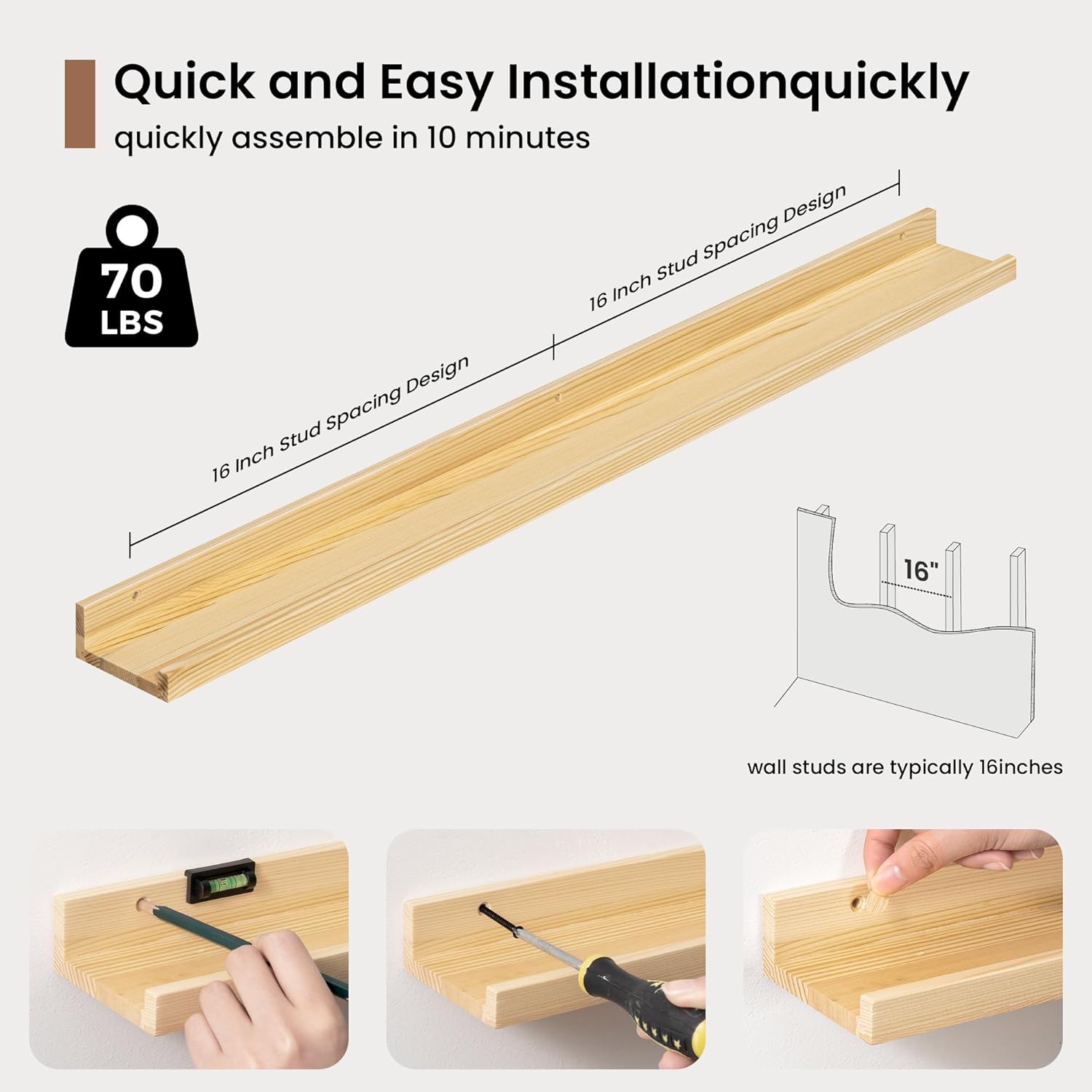 - Easy to Install: Fun Memories fully assembled solid pine wood picture ledge shelf set of 2 comes with the pre-drilled holes and necessary hardware including a mini level to make installation a breeze. The floating design creates a seamless, streamlined look, adding a touch of modern sophistication to your interior. If you have any questions about our products, please feel free to contact us