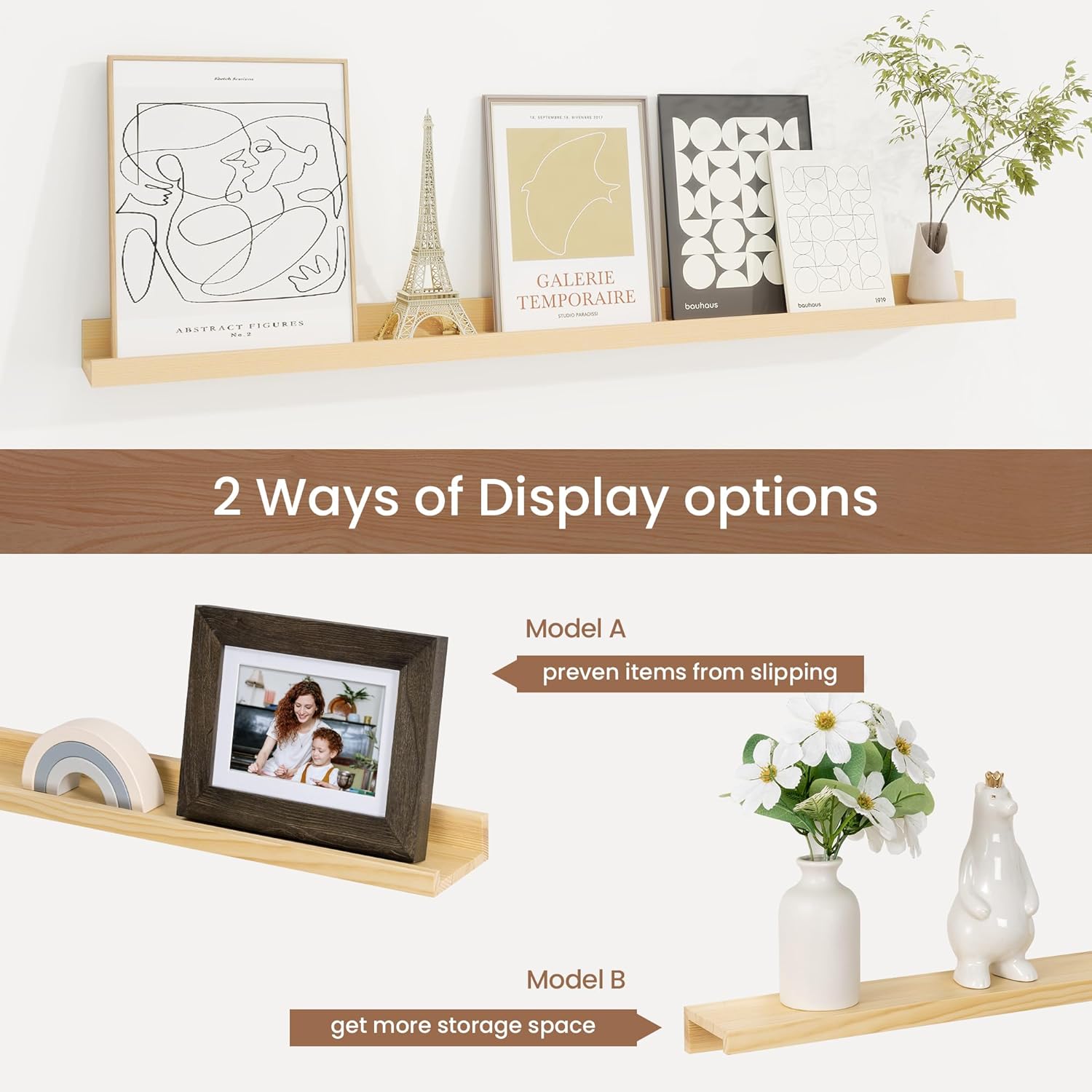 - Multi-Functional Picture Ledge: Get creative and find more functions other than the long picture ledge shelf. Fun Memories solid pine wood storage ledge shelves can act as a kids' bookshelf, display shelf for collectibles figures, spice racks in the kitchen, and more