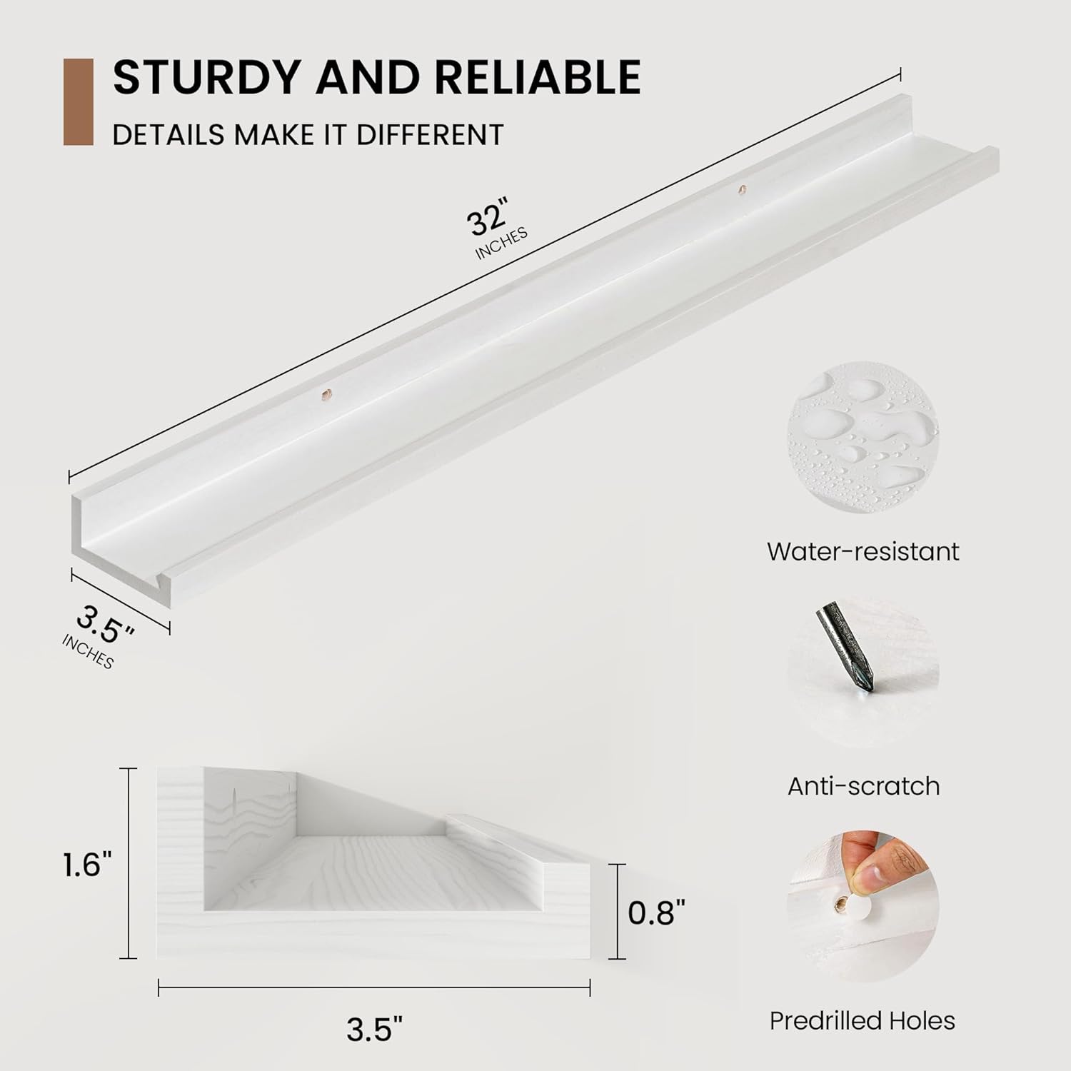 Picture Ledge Shelf, Solid Pine Wood Floating Shelves Set of 2, 32 Inches Nursery Book Shelves for Toys Storage, Kids Bookshelf Wall Mounted for Living Room Bedroom Decor Books Photo Frames, White