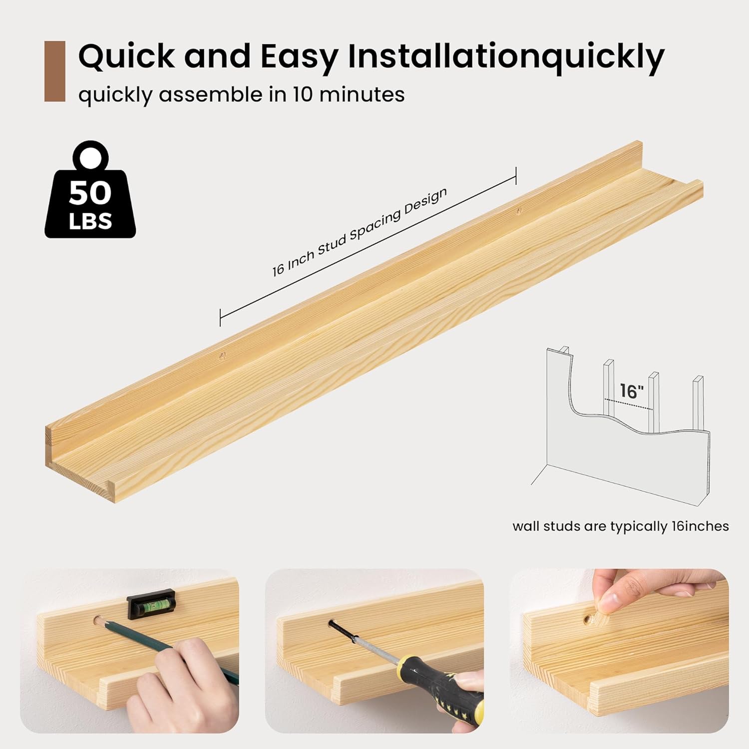 - Unique Solid Pine Wood Shelves: Each picture ledge is meticulously handcrafted from premium solid pine wood, showcasing one-of-a-kind grain patterns, organic color variations, and a hand-finished texture. No two shelves are identical—transform your space with a bespoke touch that reflects your individuality
