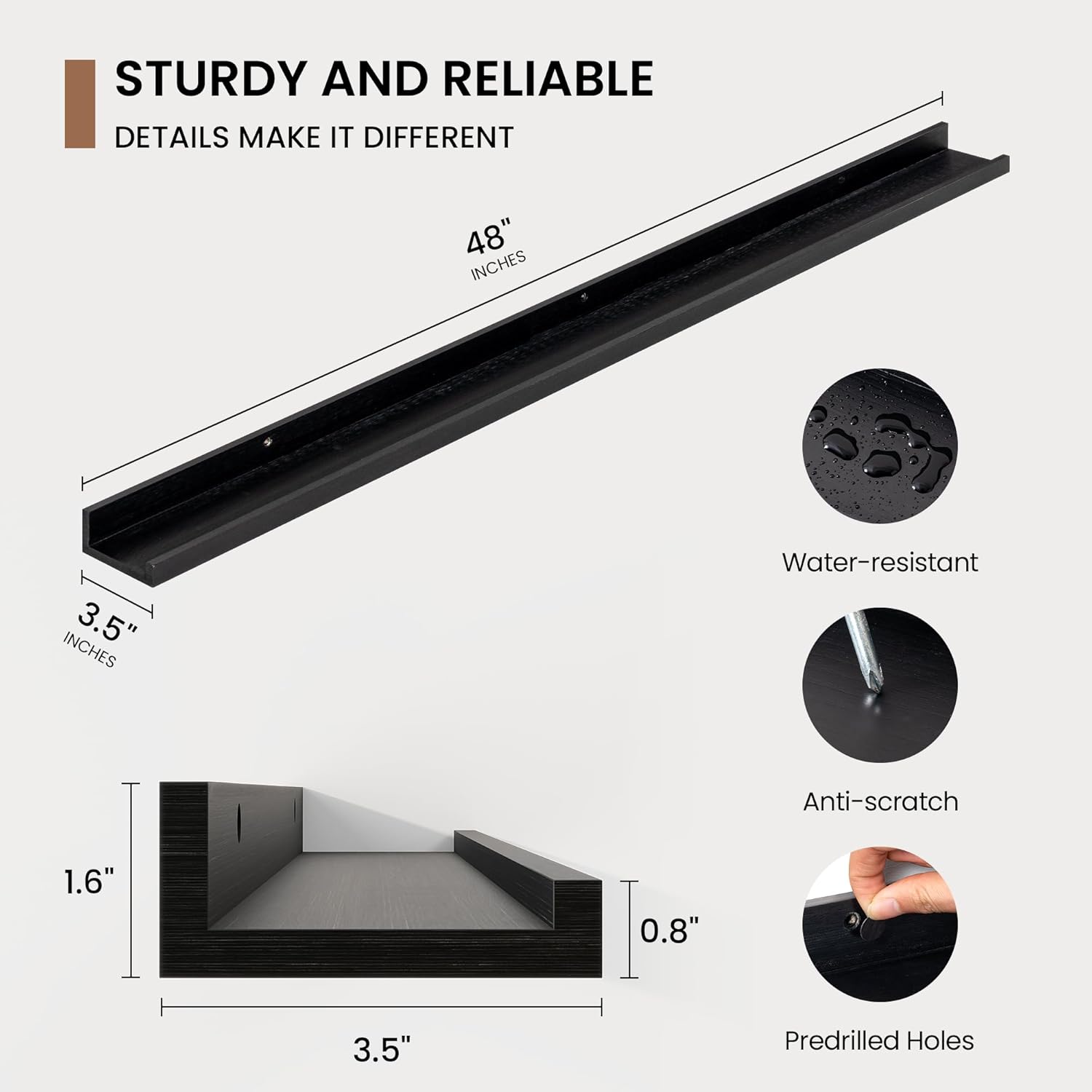 - 3.5" Floating Picture Ledge: Anti-Slip Narrow Design-3.5" ultra-narrow depth holds frames/plants without sliding, even on angled walls. Stud-Mounted Stability-16" pre-drilled holes match standard studs (hardware incl.) for wobble-free install. Clutter-Free Aesthetic-Clean lines blend with farmhouse/Scandinavian decor, focusing on your treasures