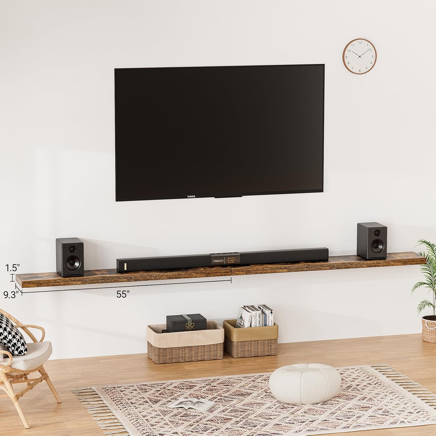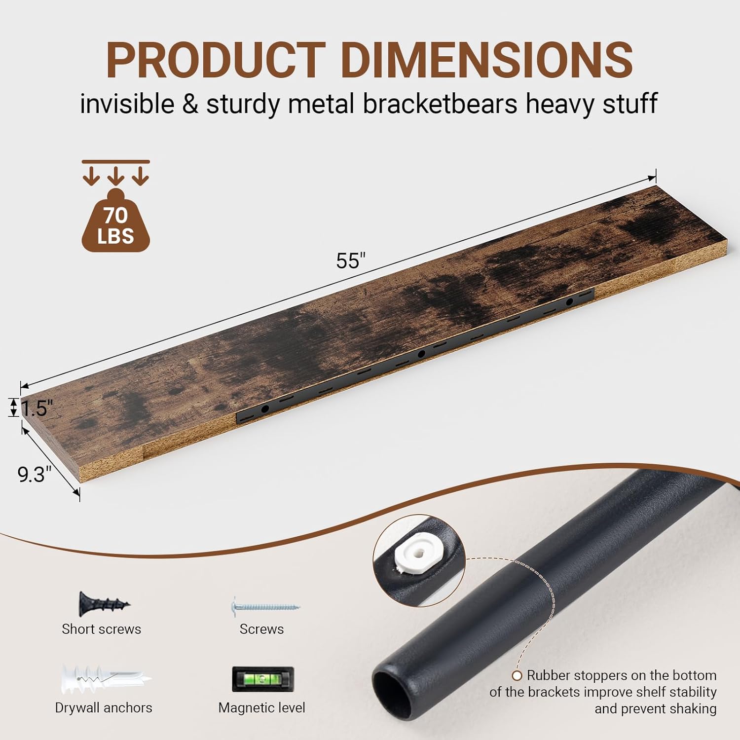 - 【Longer Design】Our pretty wall shelves are 55"W x 9.3"D x 1.5"H.Our brown floating shelves is longer than traditional designs and can hold more items.The rustic brown floating shelves optimize wall space,helping organize essentials without taking up floor space in your home.