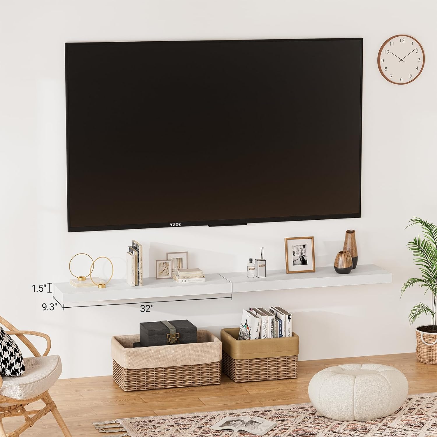 - 【Longer Design】Our pretty 32 inch white wall shelves are 32"W x 9.3"D x 1.5"H.Our 32 floating shelves is longer than traditional designs and can hold more items.The white floating shelf optimize wall space,helping organize essentials without taking up floor space in your home.