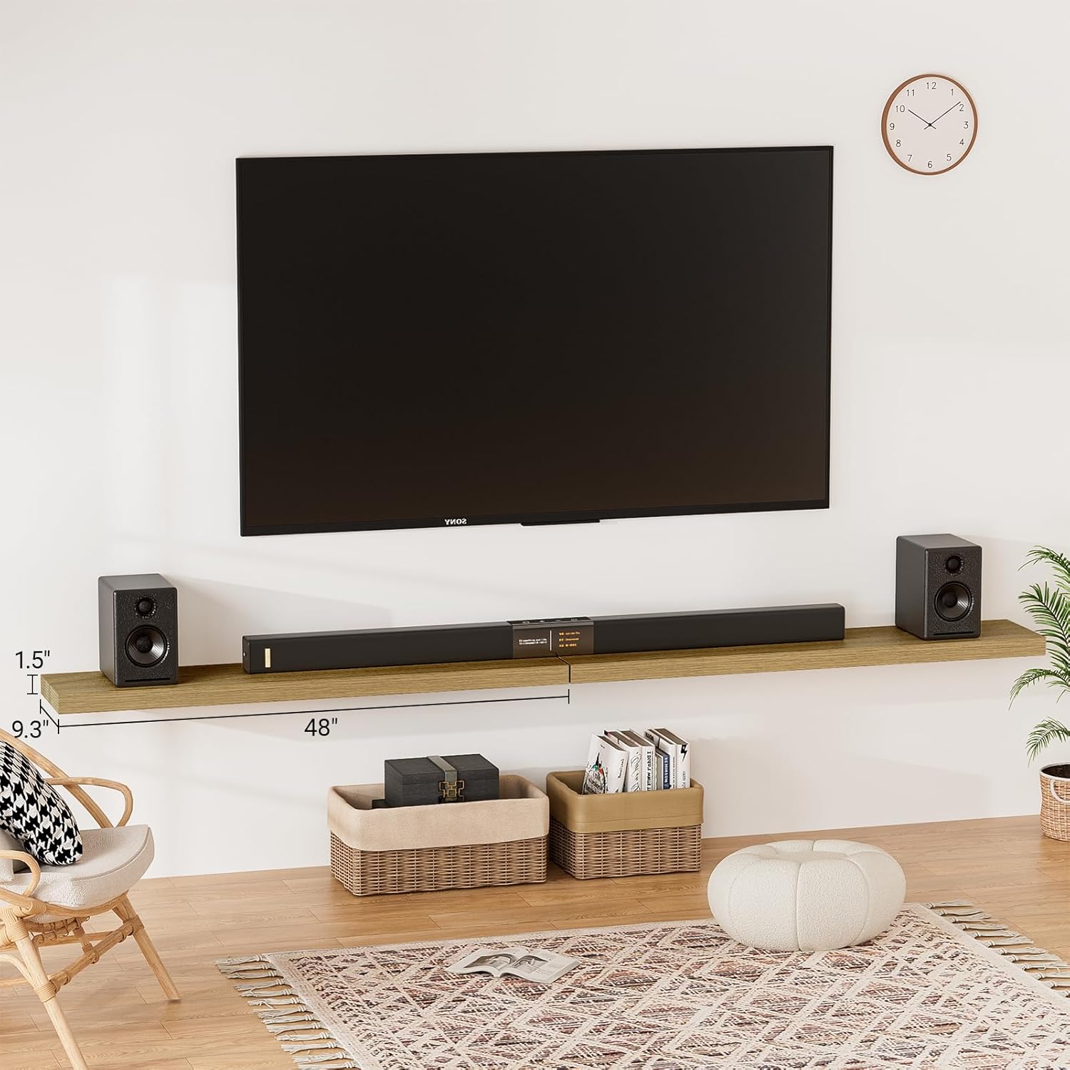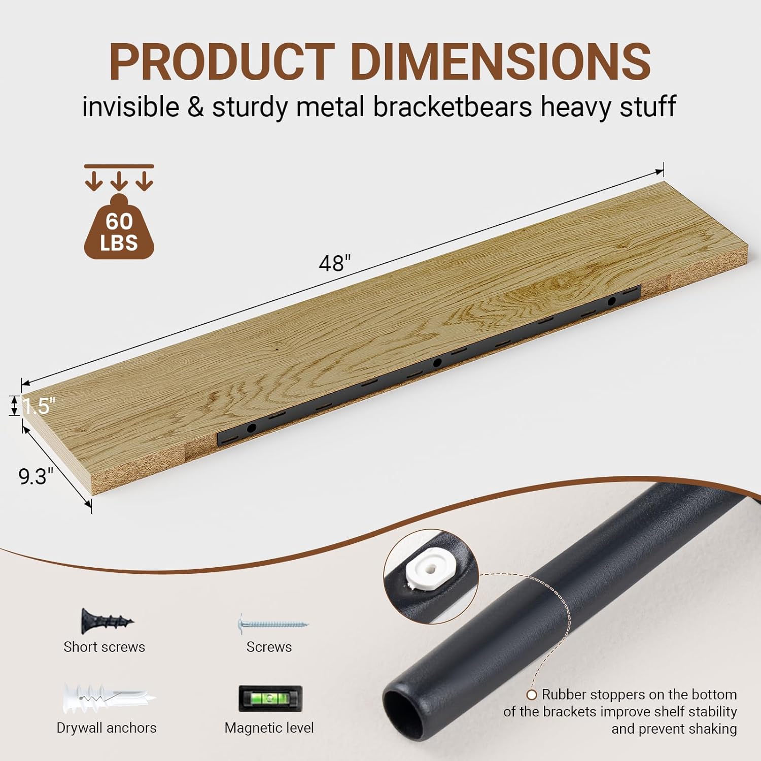 - 【Longer Design】Our pretty white oak floating shelves are 48"W x 9.3"D x 1.5"H.Our wall shelf is longer than traditional designs and can hold more items.The floating shelves oak optimize wall space,helping organize essentials without taking up floor space in your home.