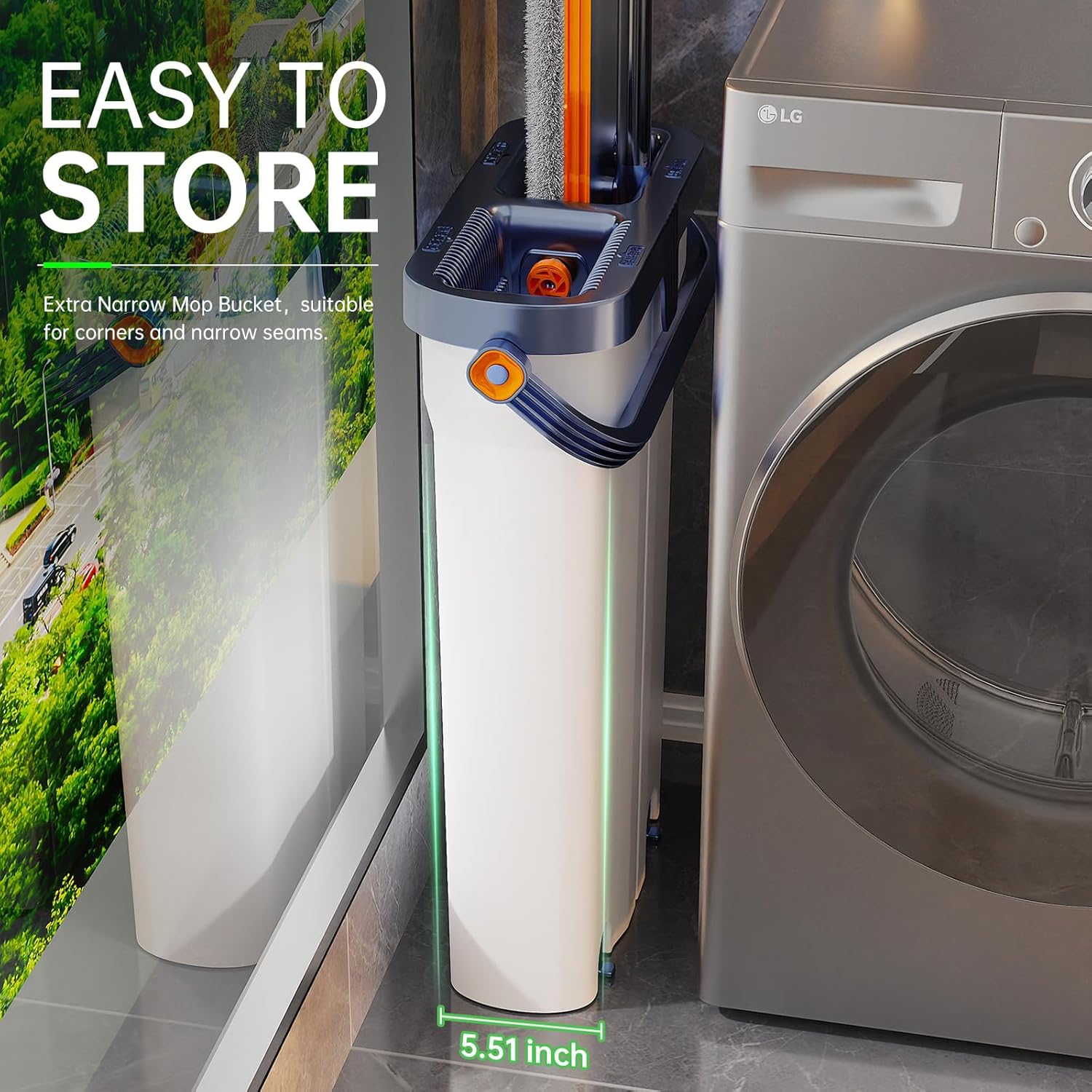 - Space-Saving Design & Additional Features: The narrow, compact bucket fits into tight spaces like behind doors or in narrow gaps. Additionally, the mop features two extra holes for cleaning solutions and is compatible with paper towels or thin pads. The automatic rebound mop head and soft scraper make cleaning in bathrooms or other wet areas easy.