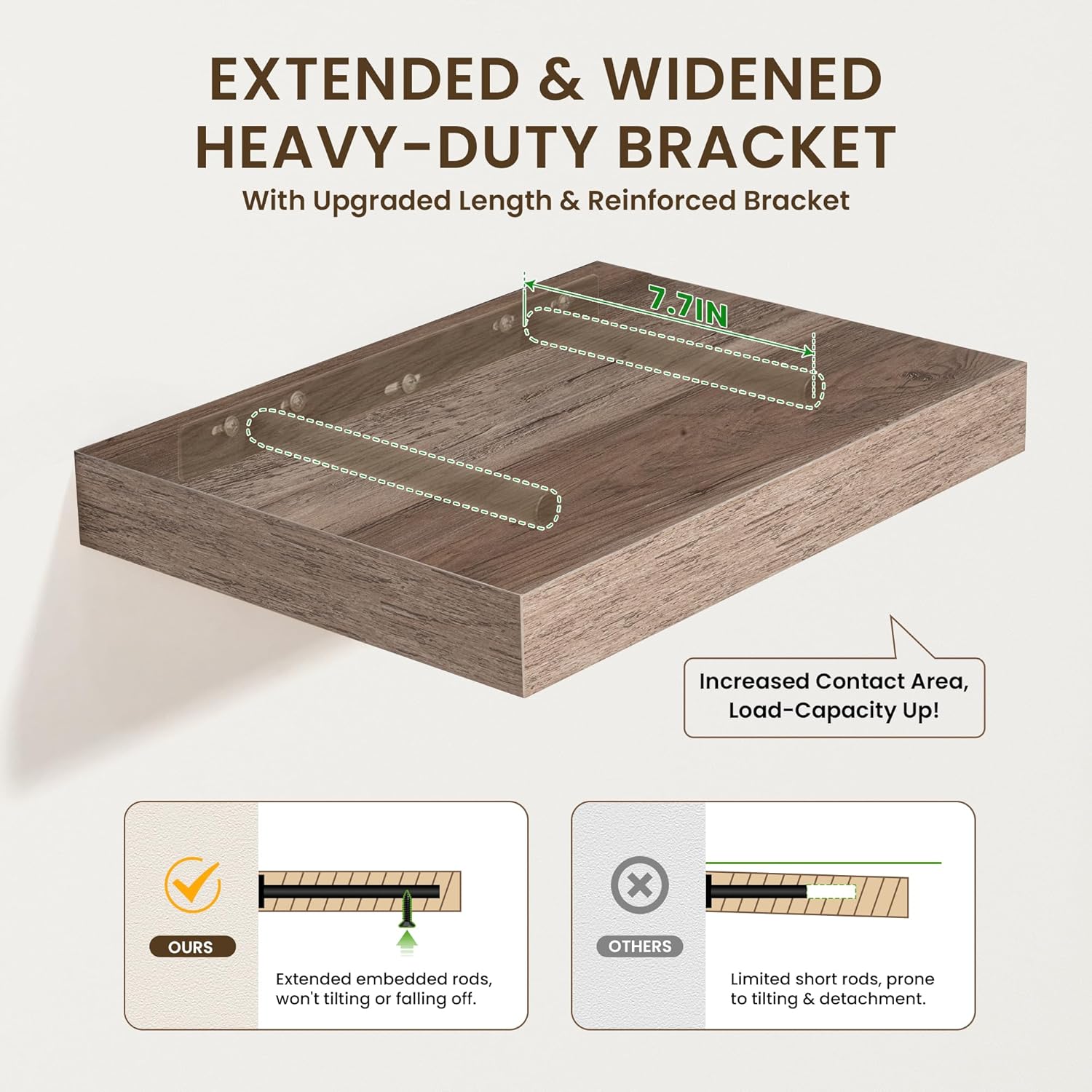 - UPGRADED MOUNTING SYSTEM-The extended supporting bars on the metal brackets ensure our wall shelves remain sturdy, preventing any wobbling or sagging. Plus, the included plastic plugs guarantee the shelves to stay firmly in place