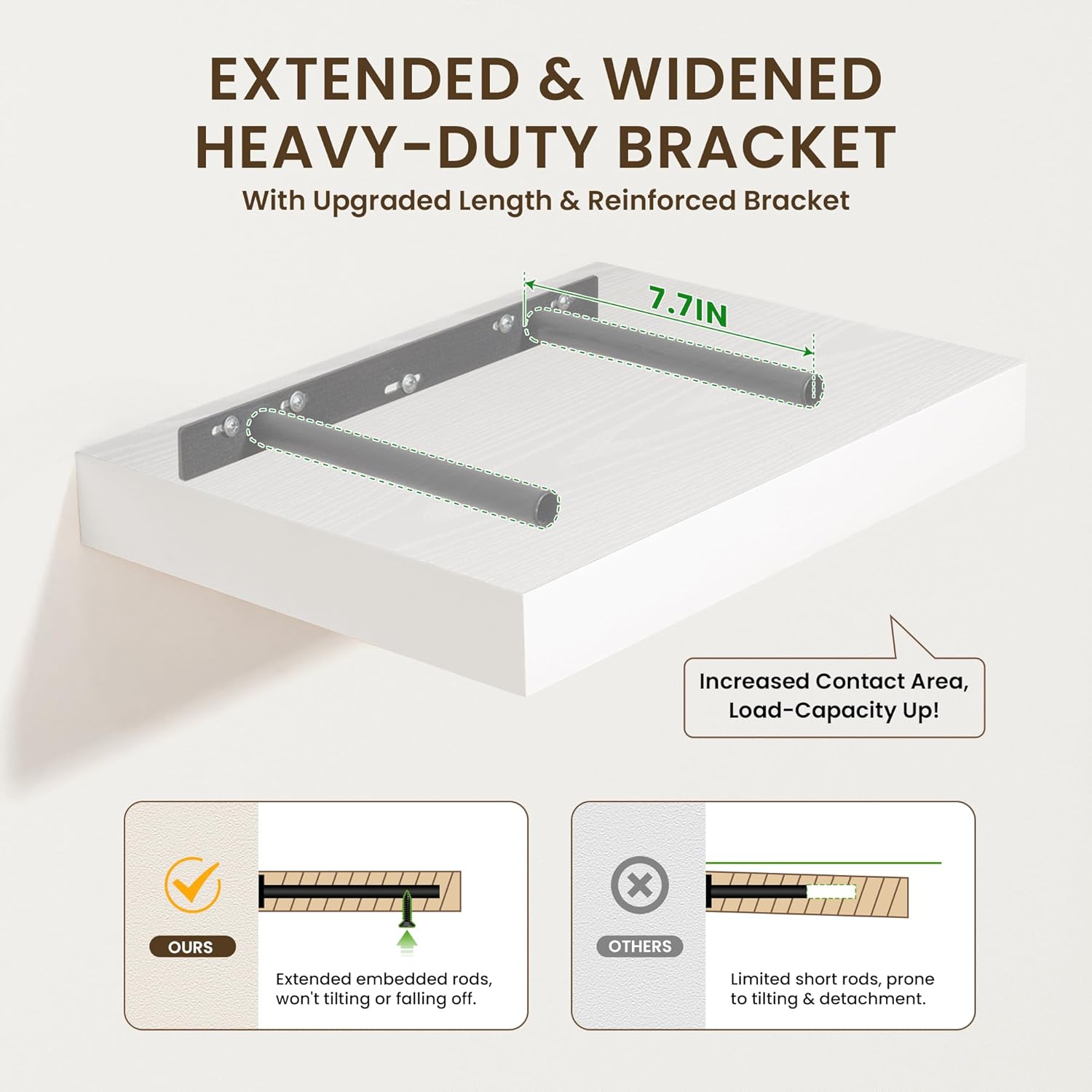 - UPGRADED MOUNTING SYSTEM-The extended supporting bars on the metal brackets ensure our wall shelves remain sturdy, preventing any wobbling or sagging. Plus, the included plastic plugs guarantee the shelves to stay firmly in place