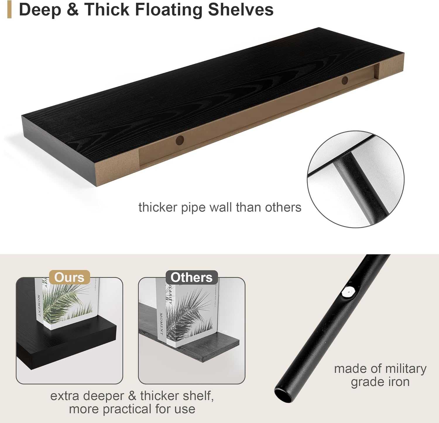- 12 Inches Deep Floating Shelves :This extra deeper and thicker wall shelves are 24"L x 12"D x 2" H,with a capacity of 55Lbs. Our shelves for wall decor create a variety of storage spaces to organize small items on your desktop or counter.and they blend seamlessly with the rest of other decor and provide a stylish way to organize and display items.