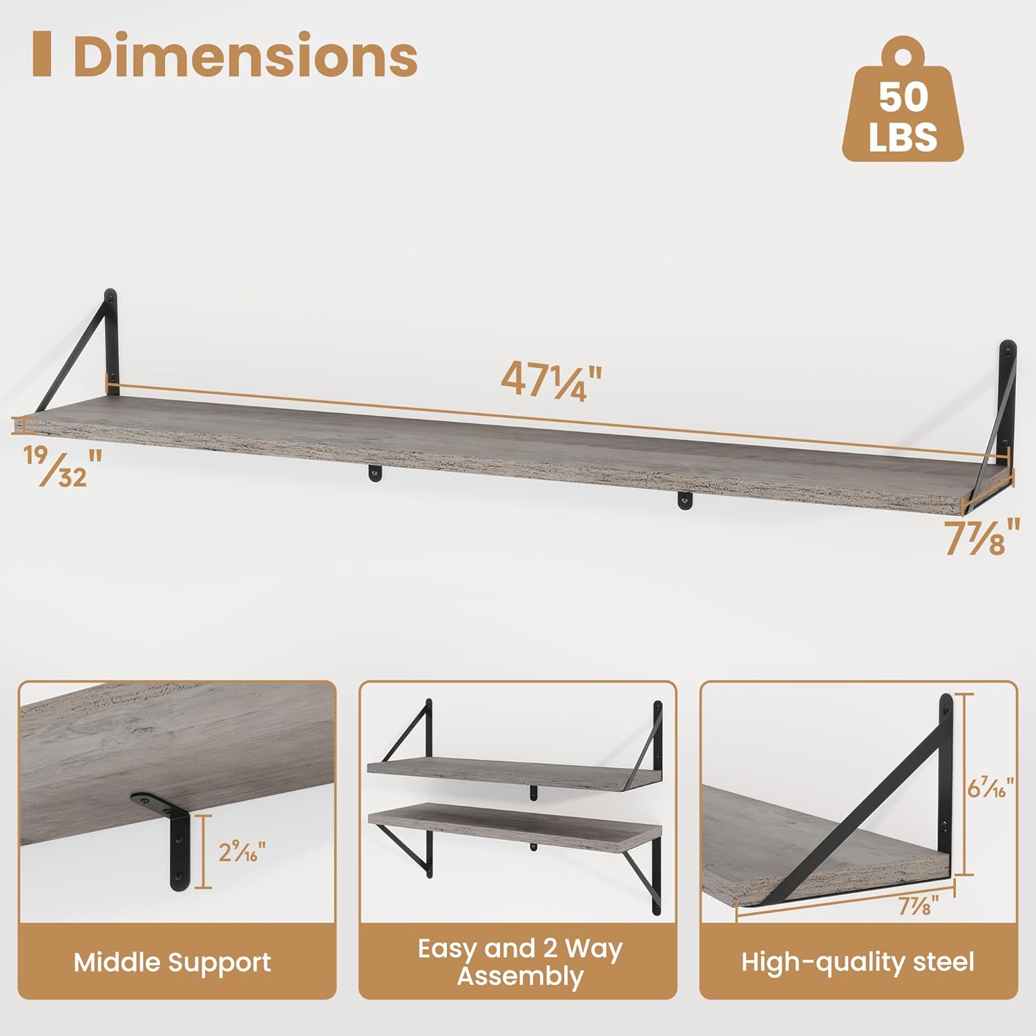 - 【Practical Wall Bookshelf】Our 47.4"W x 8"D floating shelves are your good helpers if you need extra storage space,or want to add green decorations-small indoor plants,photo frames,collection books. These floating bookshelves can free up floor and counter space,making bedrooms,living rooms and offices more tidy.