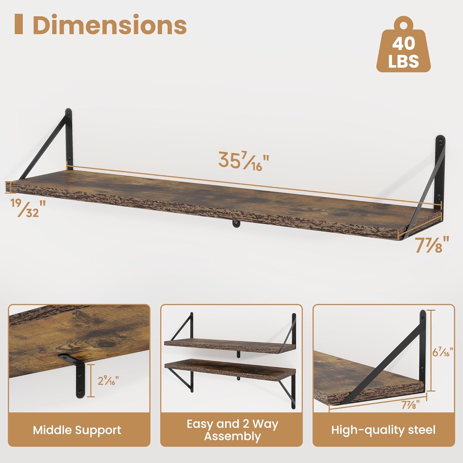 - 【Sturdy and Durable】The wall-mounted shelves are sturdy enough,with a load-bearing metal frame added in the middle,which will not deform and can withstand a weight of 40 pounds. It is very suitable for use as a wide bookshelf,TV stand,for home office,laundry room. Follow the instruction steps,including all necessary hardware,easy to assemble.