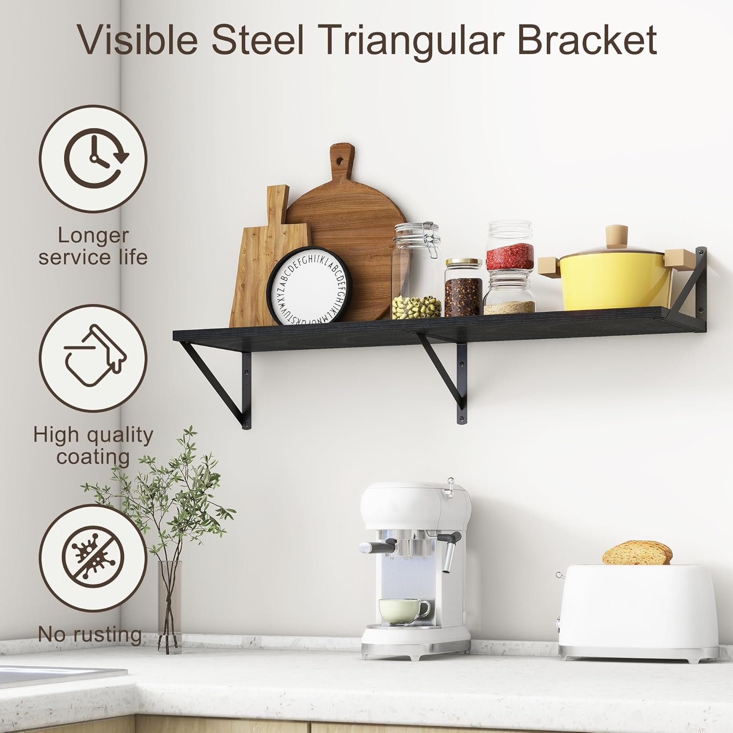 - 【FARMHOUSE RUSTIC WALL SHELF】These floating shelves are made of premium engineered wood board and visible triangular bracket. The rustic wooden grain surface add character and warmth to any modern or traditional interior with these deep floating shelves, contrast shelves at staggering heights on the wall or mount side-by-side or in the corner for a clean streamlined look.