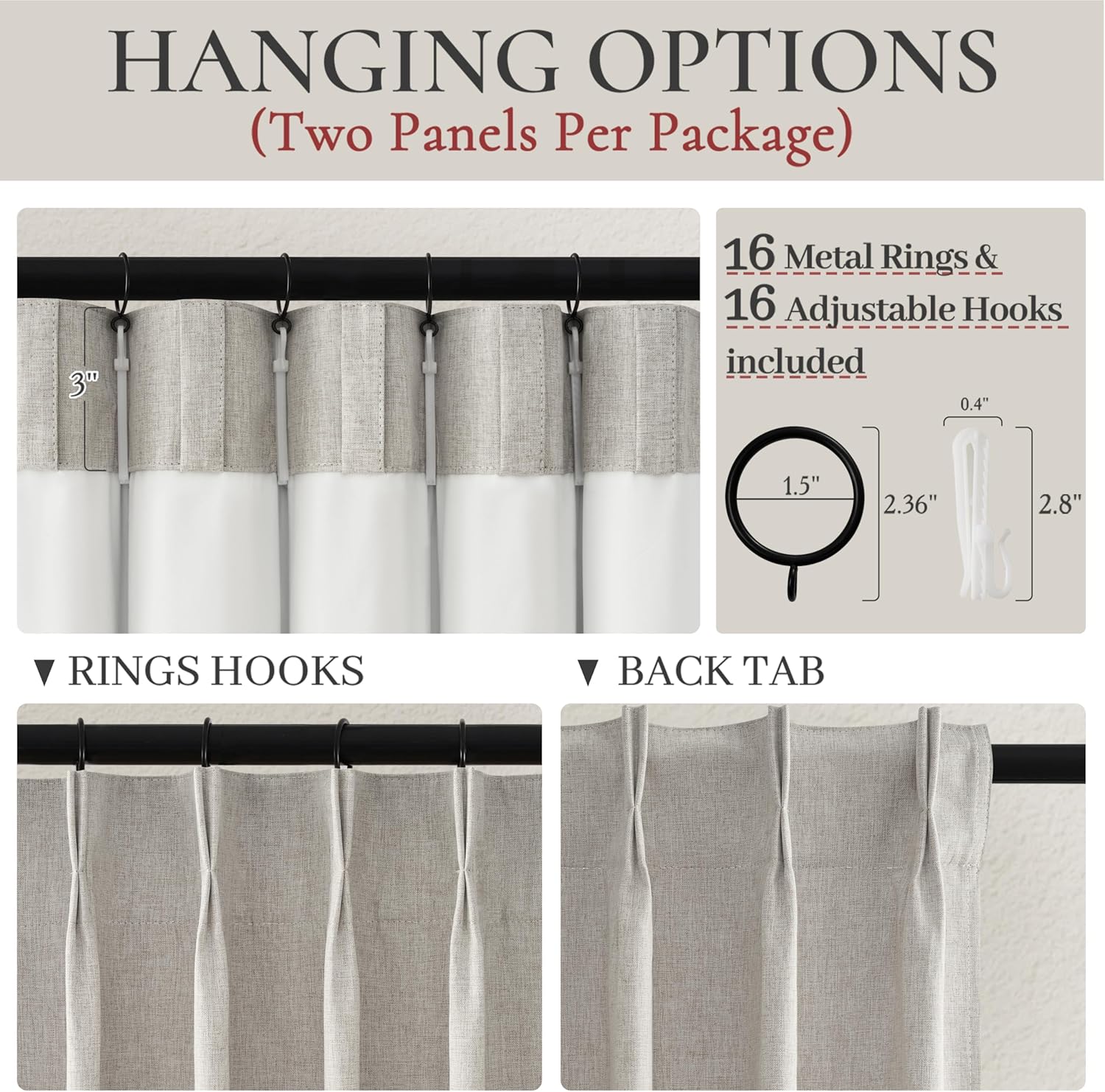 - Multiple Hanging Ways:3 hanging options to meet different home decor.1:Hanging with hooks on rings or track to easy slide (hooks,rings are included).2:Using back tab to hide the rod,easy to hang and hide the rod.3:Using clip rings(clip are not included)