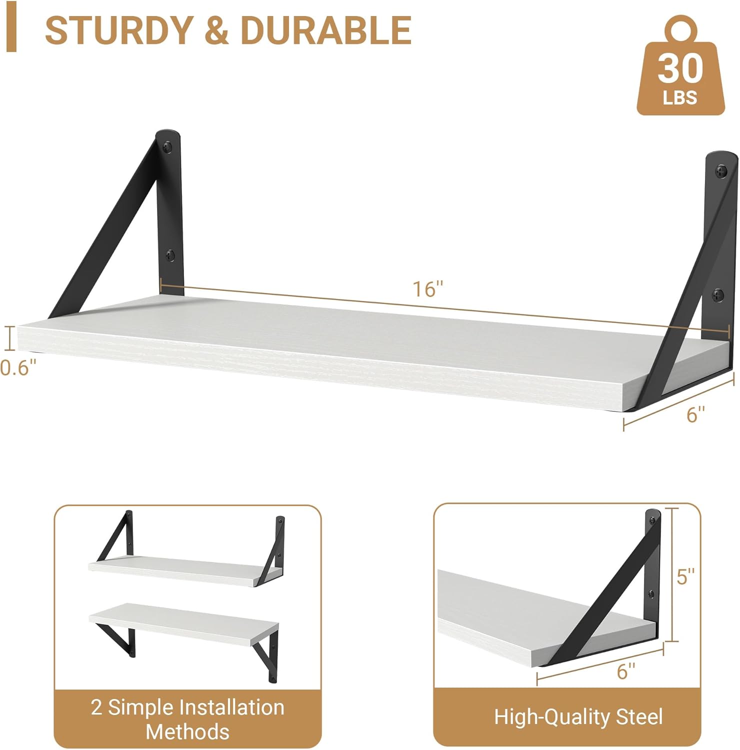 - 【STURDY & DURABLE】Each wood floating shelves is made of 0.6-inch thick natural wood planks and powder coated steel brackets for durability. The triangular metal brackets are even stronger and can hold up to 40 pounds