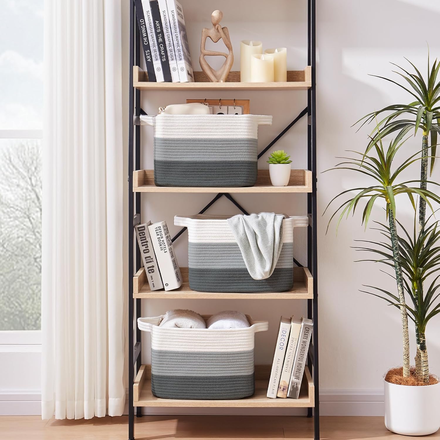 OIAHOMY Storage Basket, Woven Baskets for Storage, Cotton Rope Basket for toys,Towel Baskets for Bathroom - Pack of 3, Gradient Dark Gray