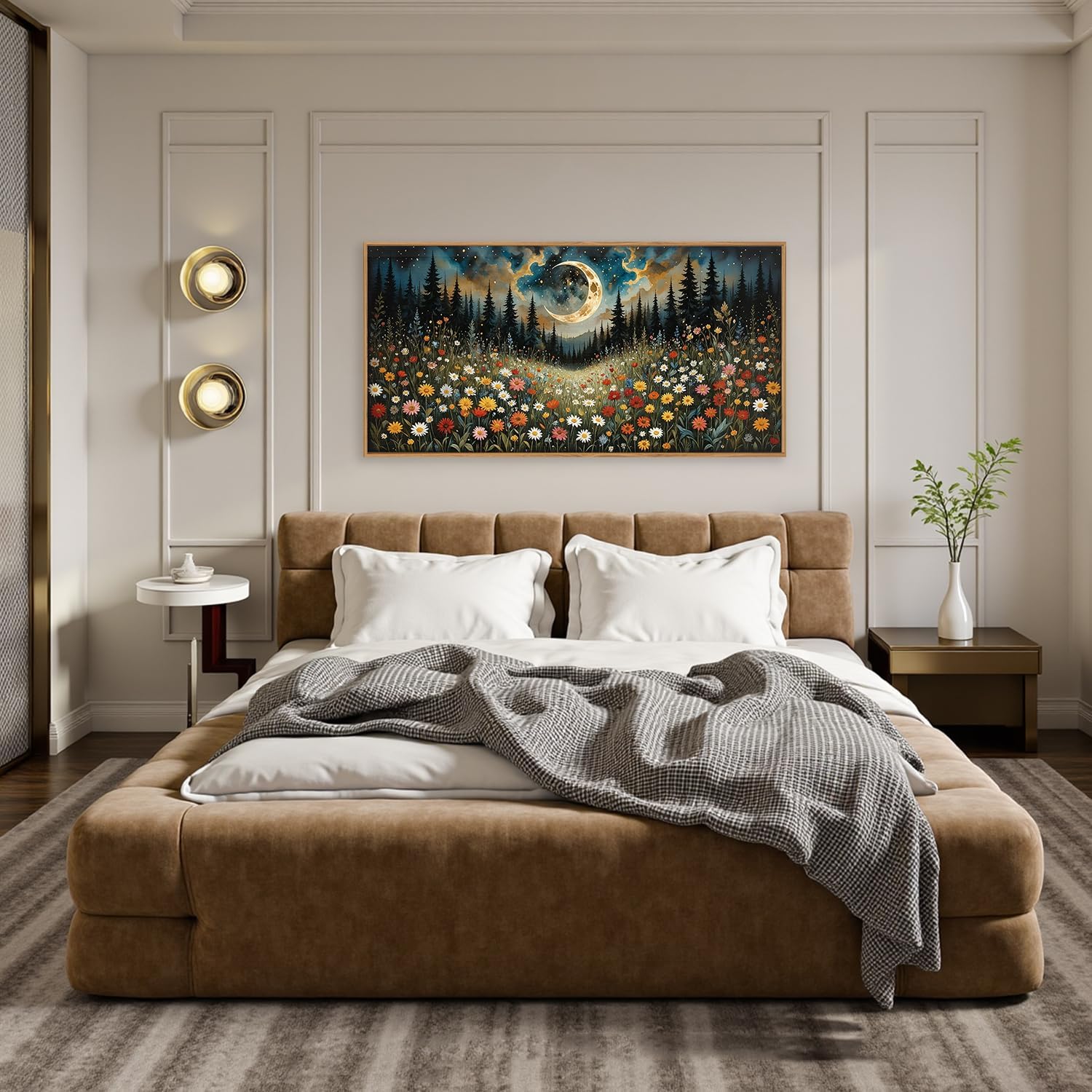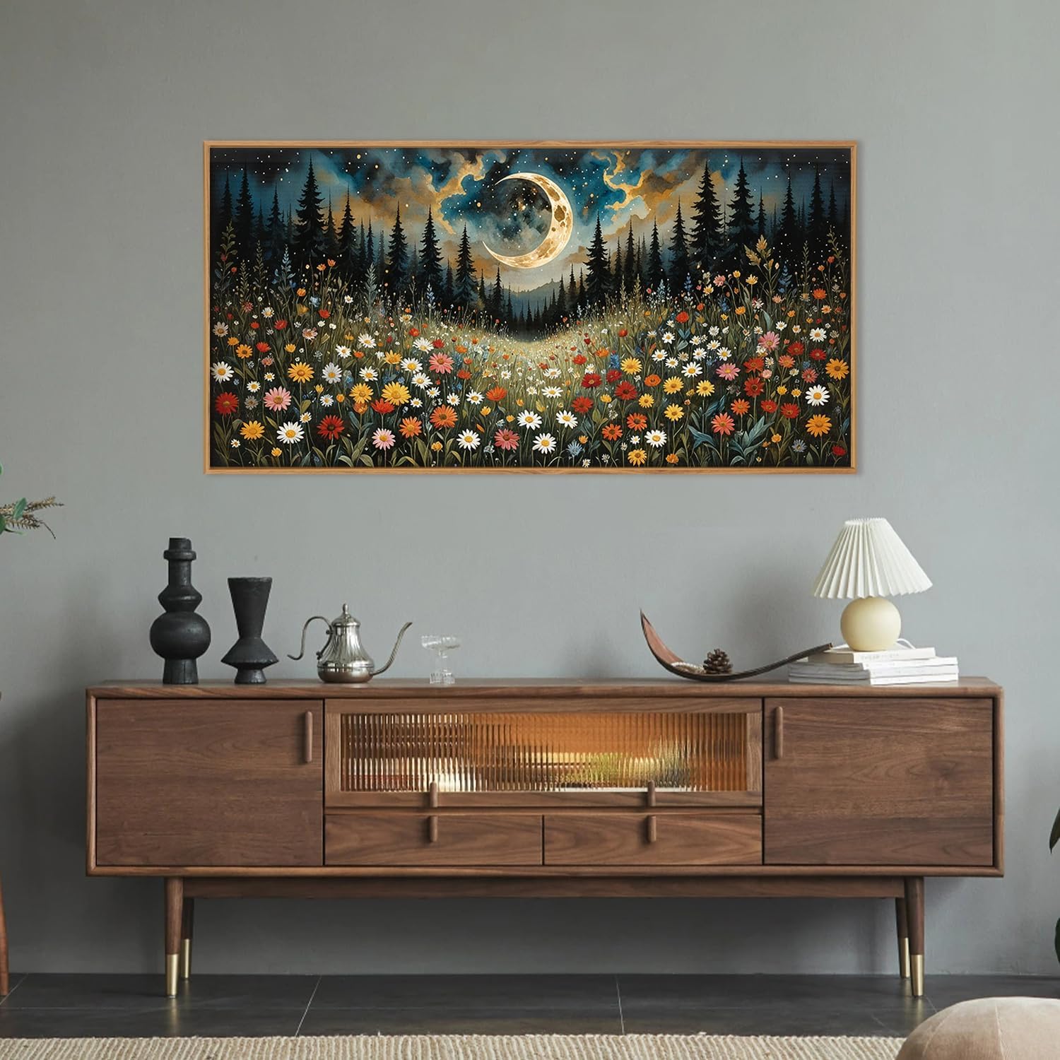 HPINUB Wildflower Moon Pine Tree Framed Canvas Wall Art Set,Nature Forest Wall Decor,Mystical Starry Night Artwork Rustic Mountain Landscape Art Print for Living Room,Bedroom,Office-20 x40