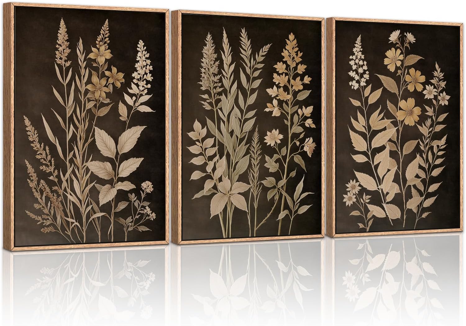 HLNIUC Vintage Botanical Fern Framed Canvas Wall Art Set,Black and Tan Plant Leaf Wall Decor,Netural Minimalist Herb Floral Art Print,Modern Farmhouse Wall Painting for Living Room,Bedroom - 16”x24”x3