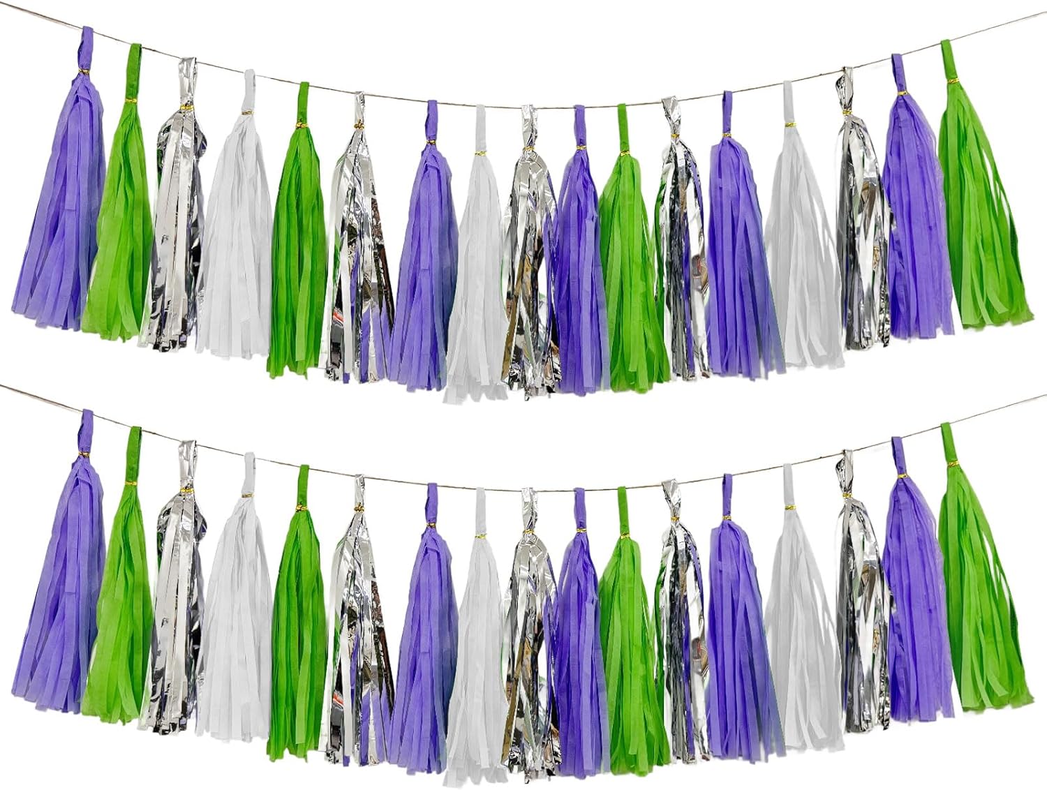 - PACKAGE CONTENTS: Set of 20 tissue paper tassels in white, green, purple, and silver colors, pre-assembled on a string for easy hanging