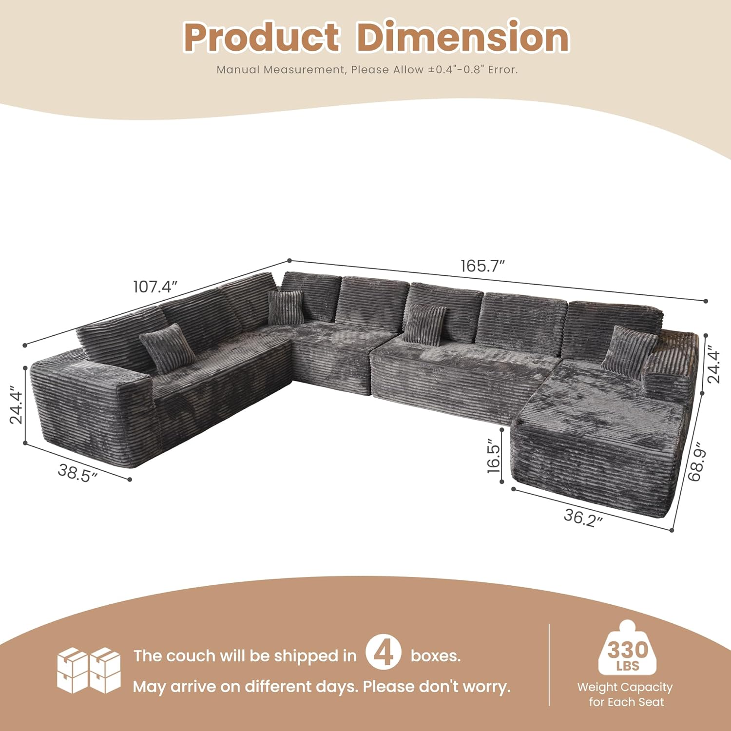 HOOOWOOO Cloud Sectional Couches for Living Room,Modular Sectional Sofa No Assembly,165X110 Inch Plush Corduroy Large U Shaped Floor Couch Set with Deep Seat Chaise Lounge(Gray)