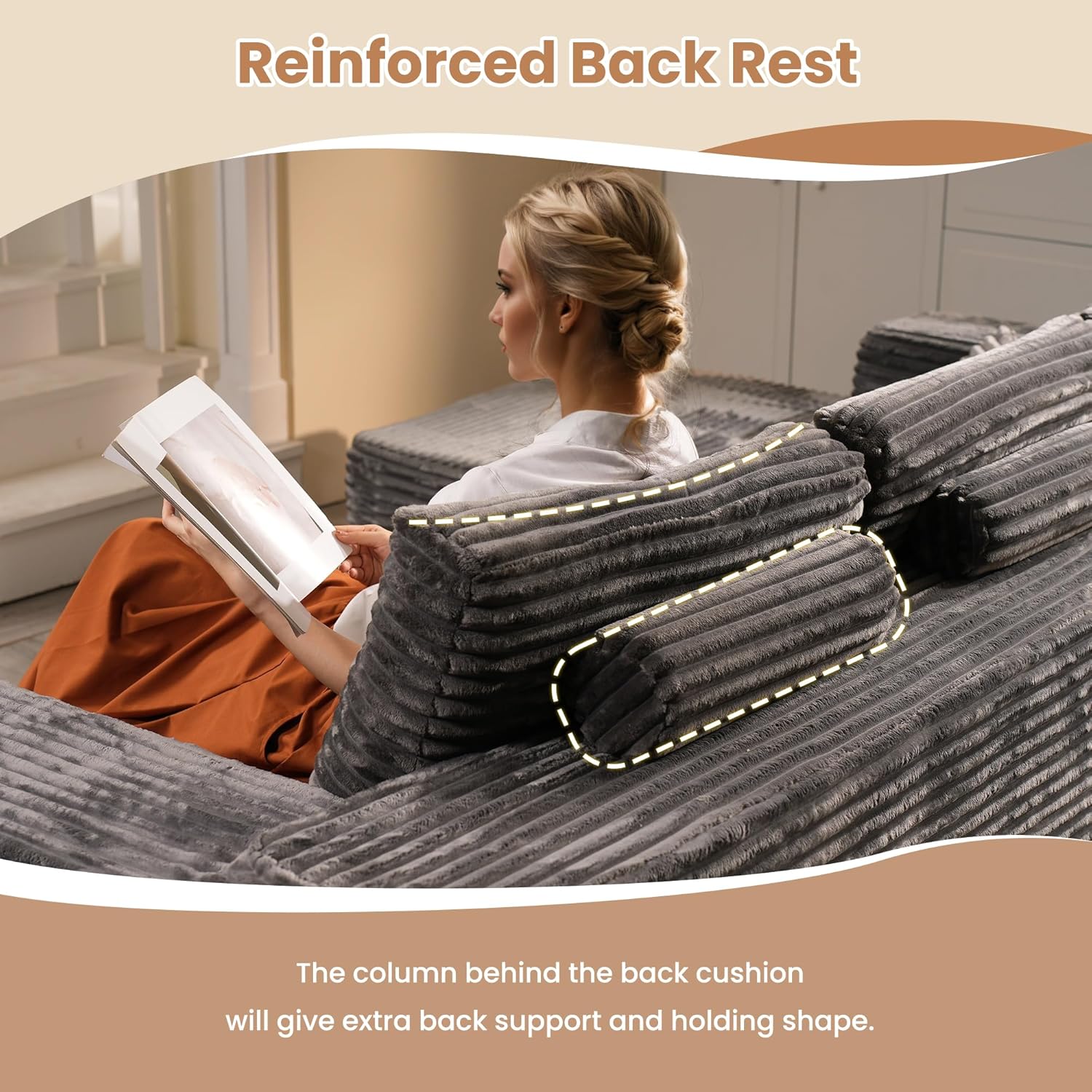- Re-Enforced Back Support: Sepecially design a supportive back column behide the back pillow to re-inforce the back support and hold shape overtime