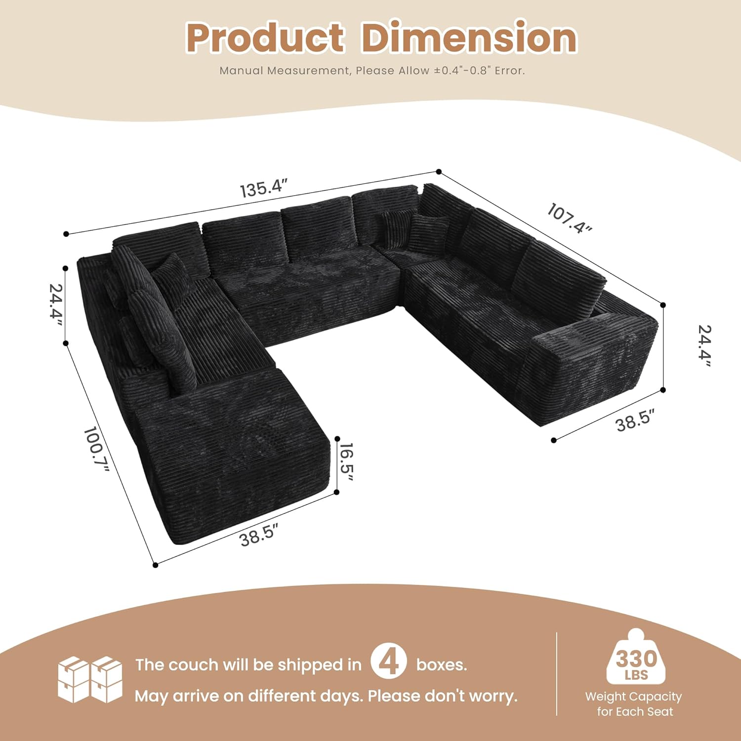 HOOOWOOO Cloud Sectional Couches for Living Room,Modular Sectional Sofa No Assembly,136X108 Inch Plush Corduroy Large U Shaped Floor Couch Set with Deep Seat Ottoman(Black)