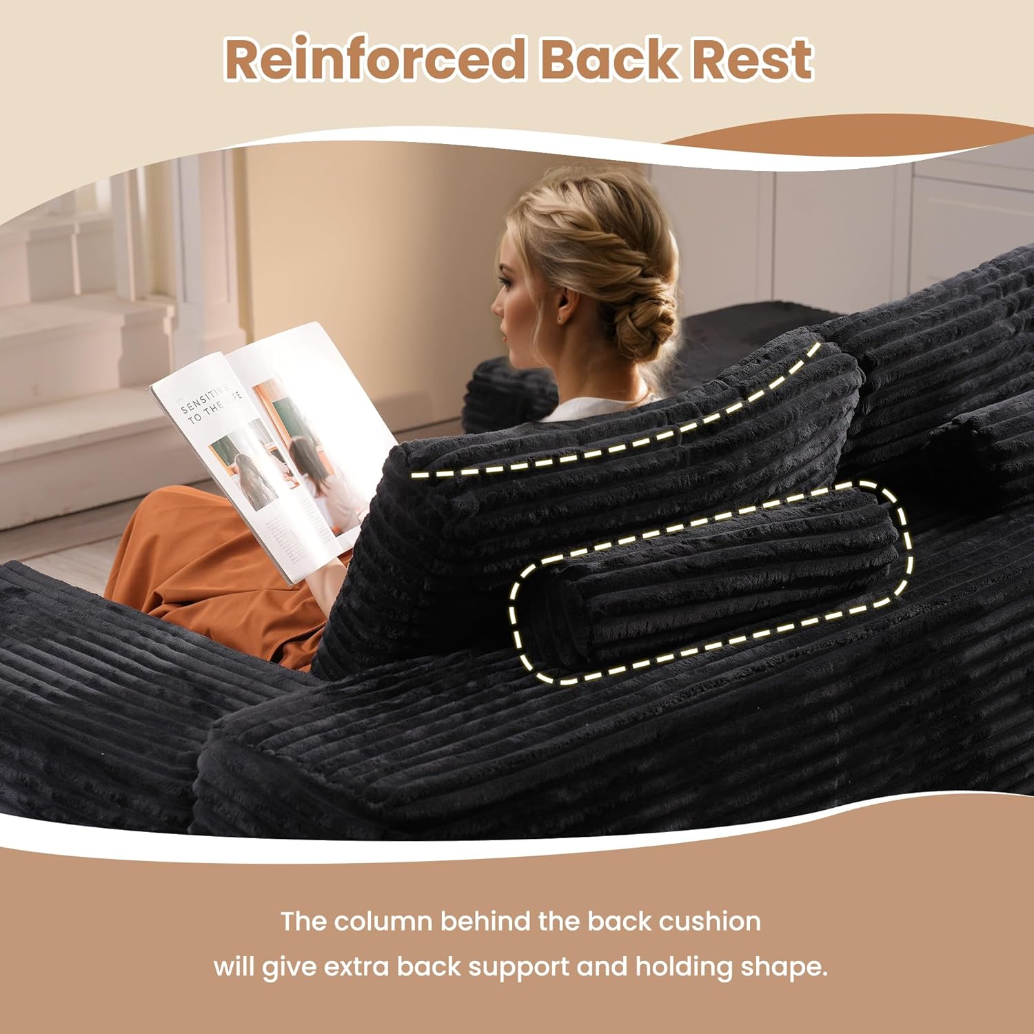 - Re-Enforced Back Support: Sepecially design a supportive back column behide the back pillow to re-inforce the back support and hold shape overtime
