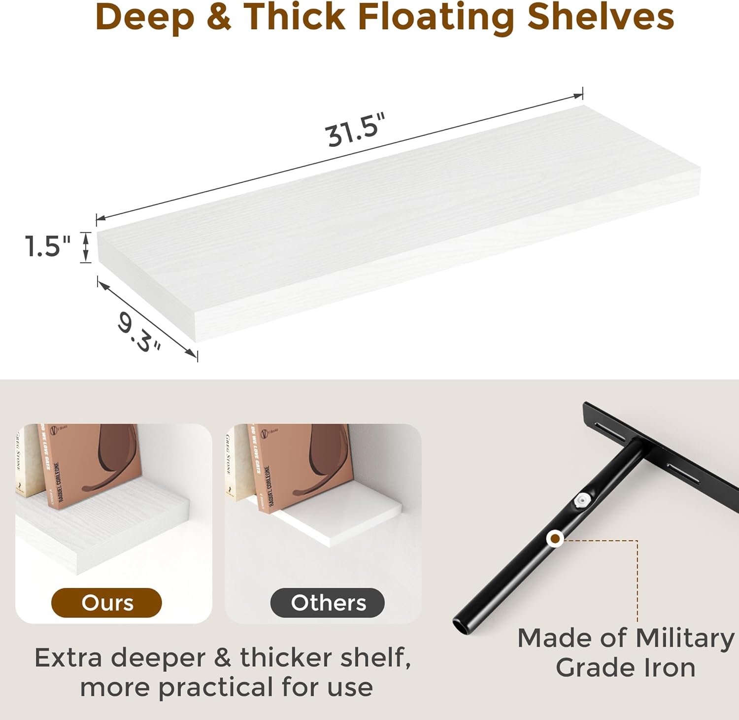 Fun Memories White Floating Shelves 32 Inch Long, 9 Inch Deep Floating Bookshelf Wall Mounted, Farmhouse Wood Shelves White for Bathroom, Living Room, Bedroom, Home Decor Deep Shelf for Wall Set of 2